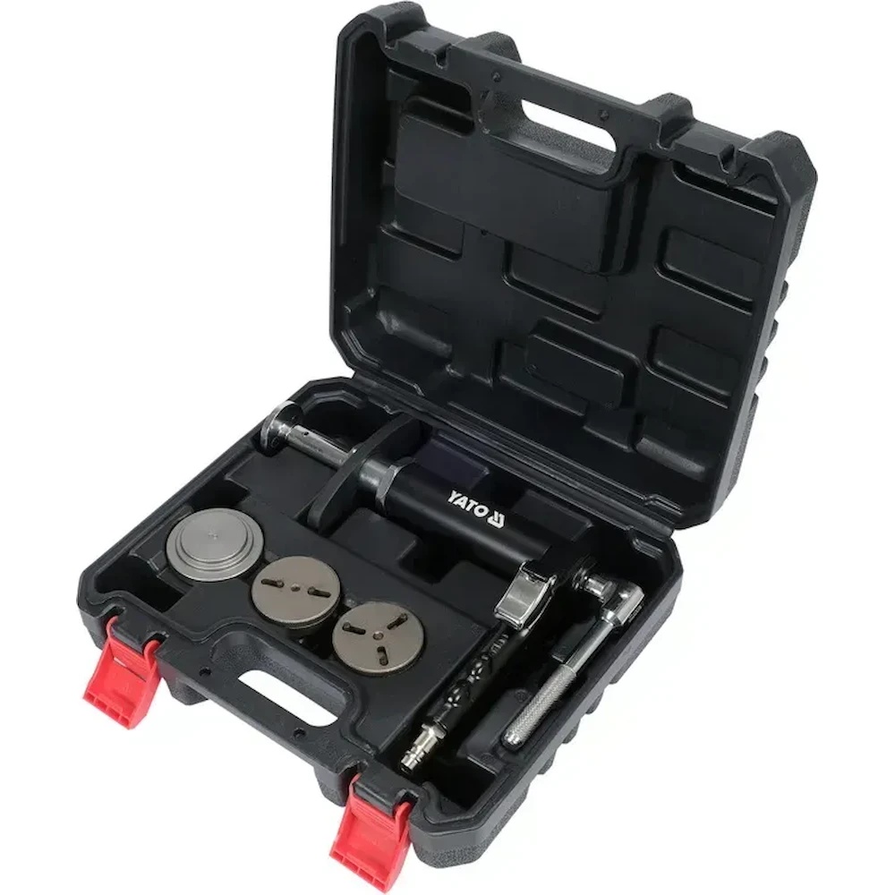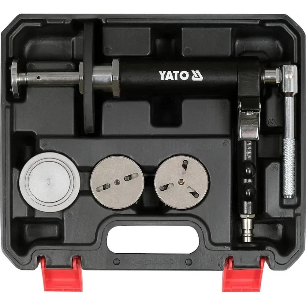 Pachetul pneumatic YATO YT-06711 pentru instalarea pistonelor de frână este compatibil cu aproape toate modelele de automobile. Maneta manuală asigură rotația la dreapta și la stânga. Pachetul include un adaptor cu conector cu două și trei contacte, destinat controlului suporturilor electronice ale frânei de parc EPB. De asemenea, include un adaptor standard cu două contacte, care permite utilizarea acestuia cu orice adaptor de piston. Este, de asemenea, potrivit pentru suporturile de frână cu funcția de frână manuală.