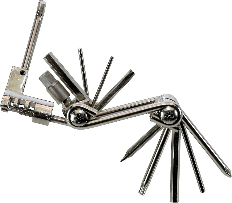 Instrumentul pliabil multifuncțional Ventura Mini Folding Tool este un set compact și ușor, care reunește 11 funcții esențiale pentru orice ciclist, pentru reparații și întreținere rapidă pe traseu. Setul include chei imbus din oțel de 2, 2.5, 3, 4, 5, 6 și 8 mm, șurubelnițe plată și Phillips, un instrument pentru nituit lanțul și cheia Torx T25. Toate componentele se pliază într-un corp compact, iar setul include o husă practică din nailon pentru transport. Cu o greutate de doar 193 g, acest set poate fi luat ușor în excursie, oferind libertate de mișcare și pregătire pentru orice mică defecțiune pe traseu.