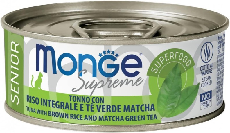 MONGE SUPREME SENIOR PISICĂ TON CU OREZ BRUN ȘI CEAI VERDE MATCHA este o hrană echilibrată pentru pisicile adulte senior. Special concepută pentru a menține greutatea corporală ideală datorită prezenței orezului brun, un superaliment și o sursă de fibre vegetale pentru un tranzit intestinal regulat. Primul ingredient este tonul, iar compoziția este îmbogățită cu fructooligozaharide (FOS), prebiotice care susțin sistemul imunitar. Cu includerea unor ingrediente selectate, cum ar fi ceaiul verde, bogat în antioxidanți care neutralizează radicalii liberi și susțin vitalitatea zilnică a pisicilor.