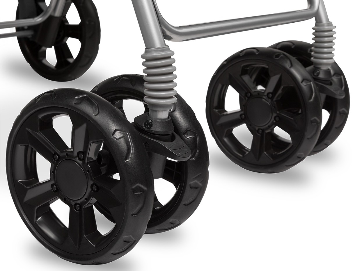 Rotile frontale sunt duble si pivotante si au dimensiunea de 7 inch. Rotile din spate au 8 inch. Prevazut cu suspensii frontale, astfel incat bebelusul sa nu mai resimta toate socurile la capacitate maxima. Manerul este acoperit cu spuma pentru manevrabilitate comoda. Solid, confectionat din aluminiu si fibra de poliester.