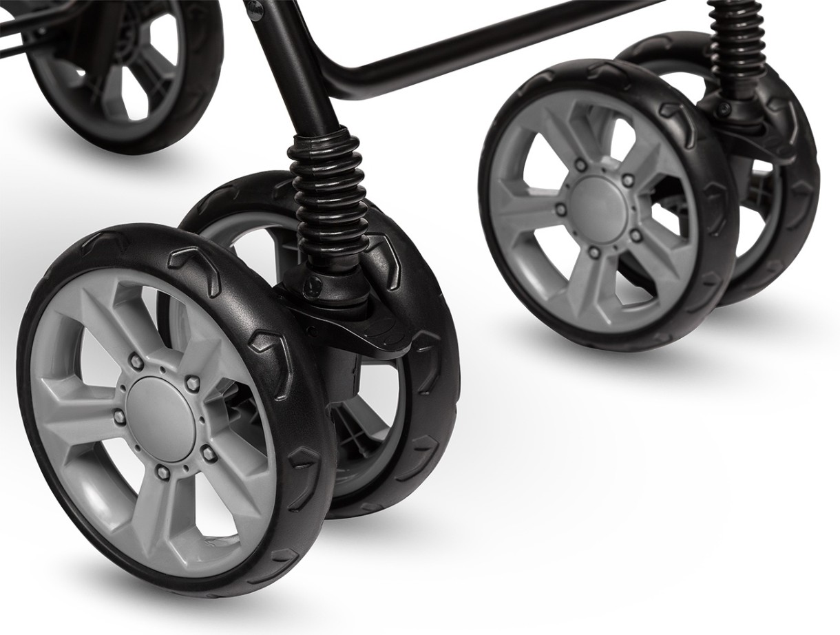 Rotile frontale sunt duble si pivotante si au dimensiunea de 7 inch. Rotile din spate au 8 inch. Prevazut cu suspensii frontale, astfel incat bebelusul sa nu mai resimta toate socurile la capacitate maxima. Manerul este acoperit cu spuma pentru manevrabilitate comoda. Solid, confectionat din aluminiu si fibra de poliester.