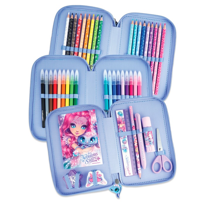 Această colecție luxoasă de penare cu trei compartimente oferă o gamă completă de articole de papetărie, plus o selecție largă de creioane și markere din lemn!