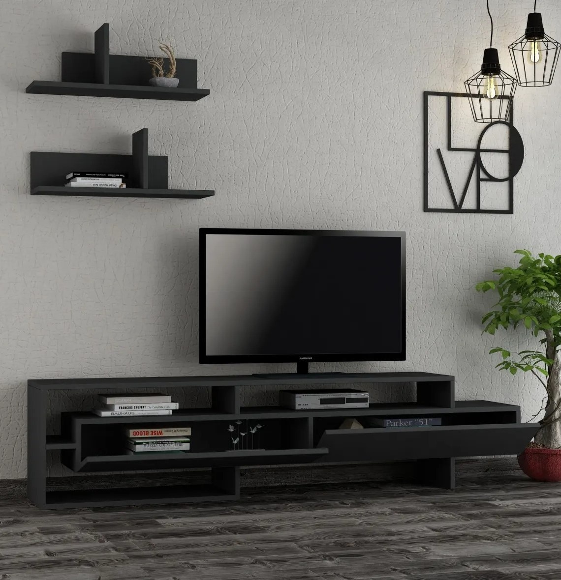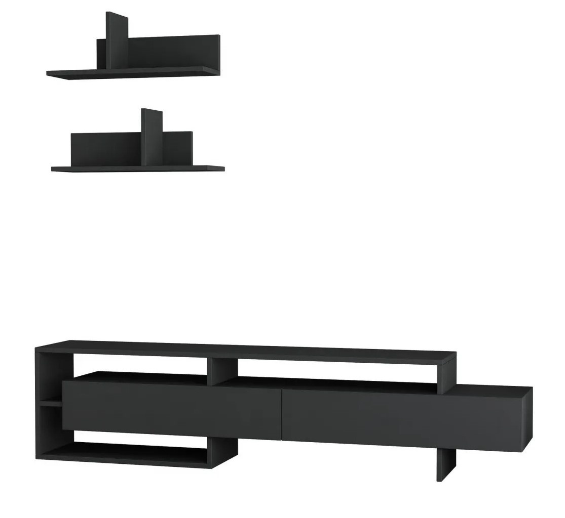 Unitatea TV este realizată din plăci aglomerate acoperite cu 100% melamină, într-o nuanță elegantă de antracit. Această culoare sofisticată adaugă lux și rafinament spațiului de locuit. Se integrează ușor în orice decor existent, fiind o alegere versatilă pentru orice stil.