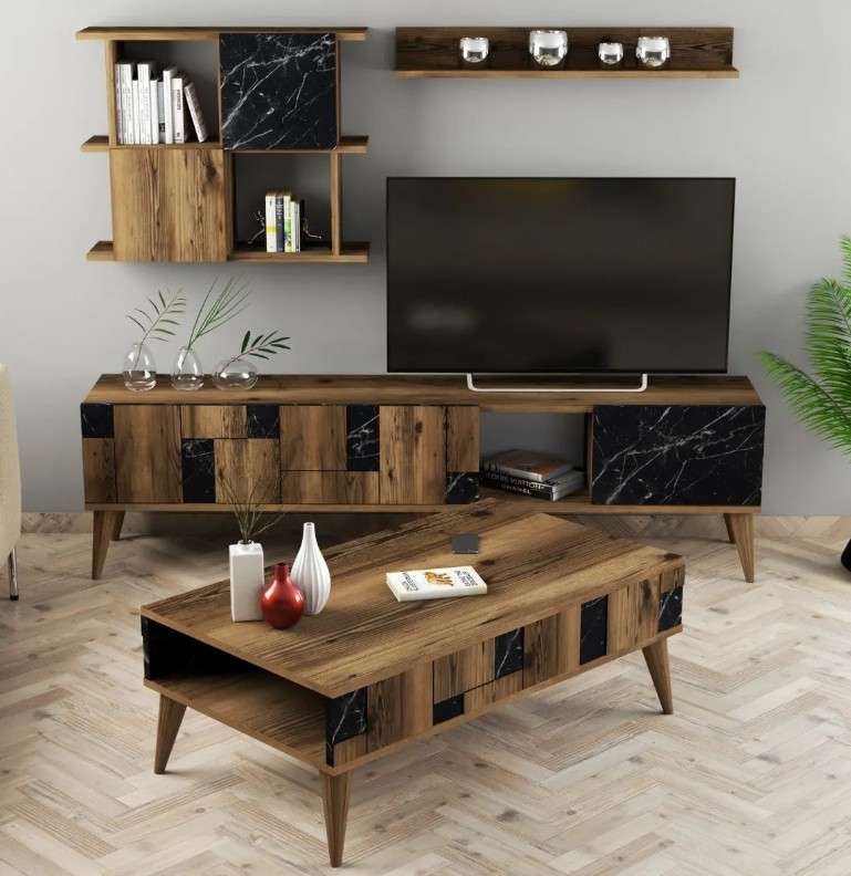 Transformați camera de zi într-un spațiu plin de stil și confort cu acest set rafinat de mobilier. Realizat din panouri de particule acoperite cu 100% melamină, setul îmbină eleganța cu durabilitatea. Unitatea TV, dulapul, raftul de perete și măsuța de cafea sunt create pentru a ridica aspectul încăperii la un nivel superior.