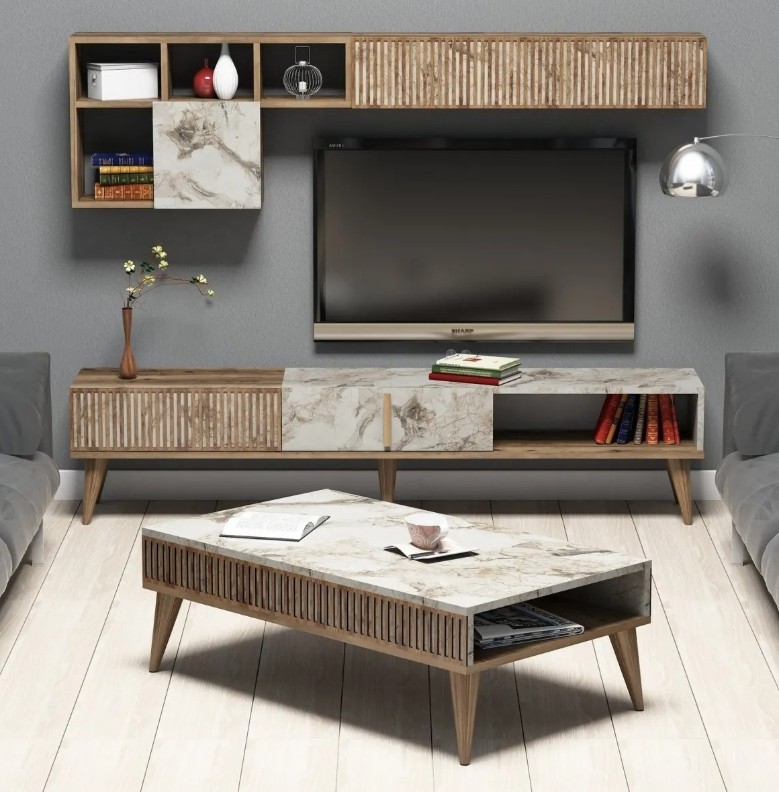 Suportul TV cu lățimea de 180 cm oferă spațiu suficient pentru articolele dedicate divertismentului. Raftul de perete, tot de 180 cm, adaugă rafinament și extinde opțiunile de depozitare. Măsuța de cafea, cu o suprafață generoasă, este potrivită atât pentru întâlniri relaxante, cât și pentru seri plăcute în familie.