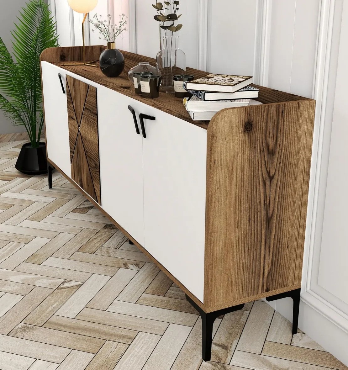 Consola industrială nu numai că oferă un design atrăgător din punct de vedere vizual, dar oferă și un spațiu amplu de depozitare. Cu o lățime de 180 cm, o înălțime de 78 cm și o adâncime de 35 cm, oferă suficient spațiu pentru a vă expune obiectele de decor preferate sau pentru a vă depozita obiectele esențiale. Mânerul metalic adaugă o notă practică, permițând accesul ușor la conținutul din interior.