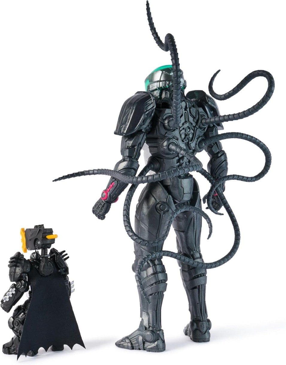 O figurină masivă Brainiac are aproape 30 cm înălțime, cu o armură metalică izbitoare și 14 tentacule articulate pentru poziții de luptă dinamice.