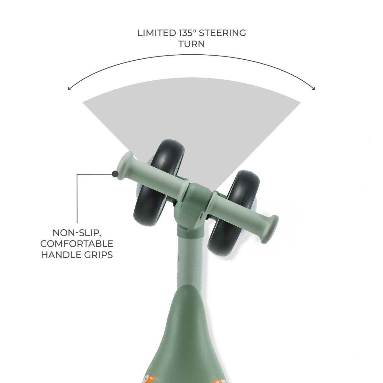 - Rotație limitată a volanului Volanul este fixat la 135°, prevenind manevrele bruște și periculoase, ceea ce este extrem de important atunci când înveți să mergi pe bicicletă. Mânerele ergonomice din cauciuc termoplastic sunt ideale pentru mâinile mici și oferă o prindere sigură și confortabilă.