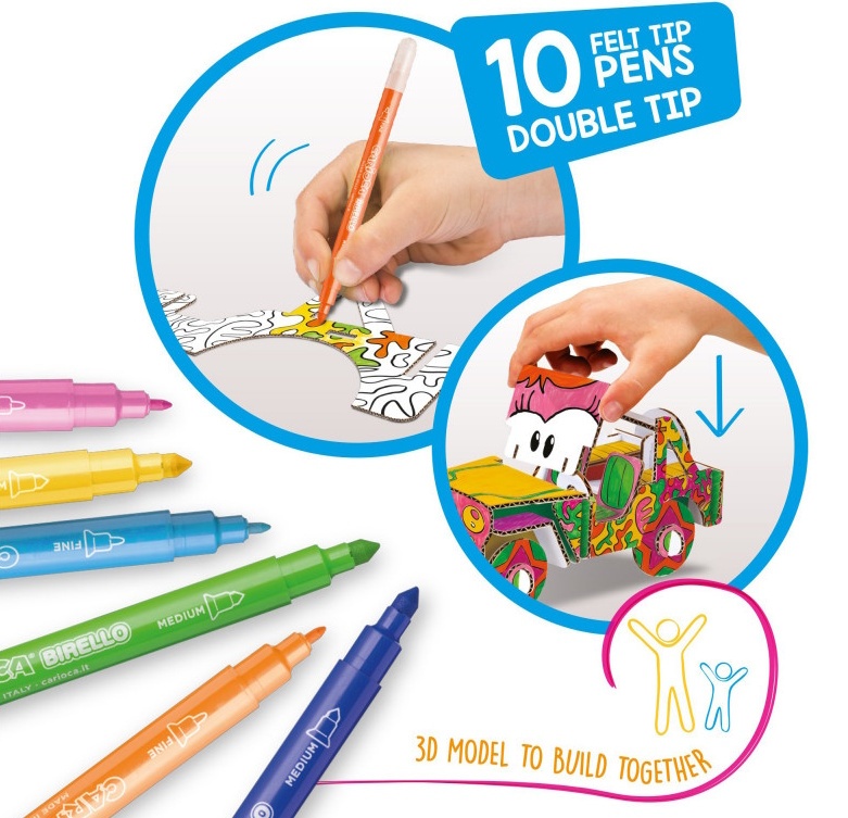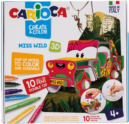 Setul creativ Carioca Create & Color Ms. Wild 3D este o activitate artistică completă care combină coloratul și asamblarea modelelor 3D, oferind o distracție creativă pentru copii. Copiii pot colora formele incluse și apoi să le asambleze în figuri tridimensionale, transformându-și creațiile într-o jucărie pe care o pot păstra sau folosi la joacă. În pachet sunt incluse 10 flomastere super lavabile, adaptate pentru mâini mici și ușor de curățat după utilizare, permițând libertate de exprimare fără griji. Materialele sunt sigure, iar modul de asamblare simplu îi ajută pe copii să-și dezvolte coordarea mână–ochi, imaginația și creativitatea pe parcursul activității.