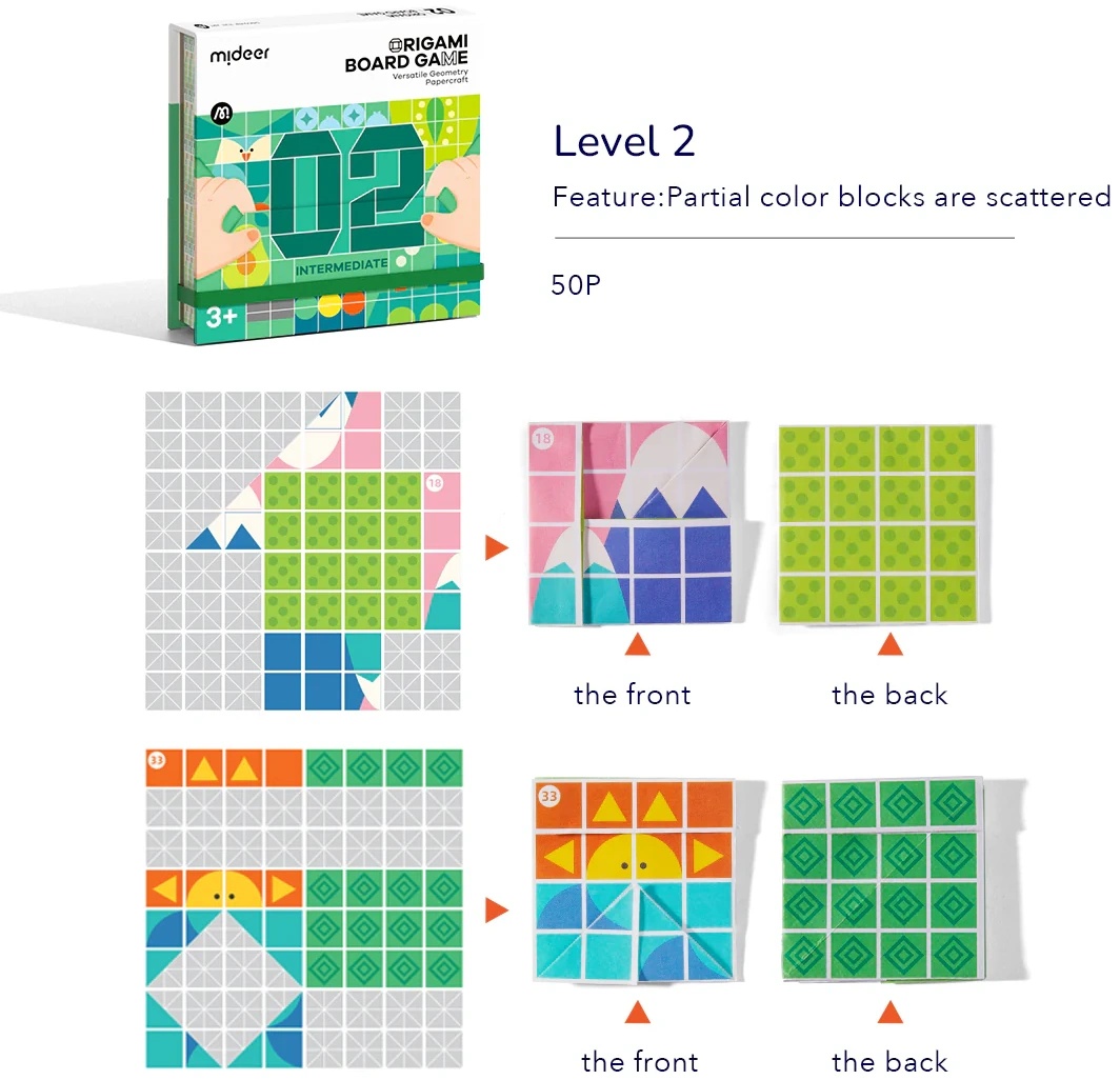 Mideer Intermediate 2- Origami Board Game Versatile Geometry Papercraft Intermediate este un joc educativ creativ pentru copii, conceput pentru a stimula creativitatea, gândirea logică și abilitățile practice prin plierea hârtiei în diverse forme geometrice. Această ediție Intermediate are un nivel de dificultate mai ridicat decât ediția pentru începători, cu blocuri de culoare mai dispersate, astfel încât copiii să învețe tehnici origami mai avansate, să-și dezvolte imaginația și perseverența și să se bucure de provocări distractive.
