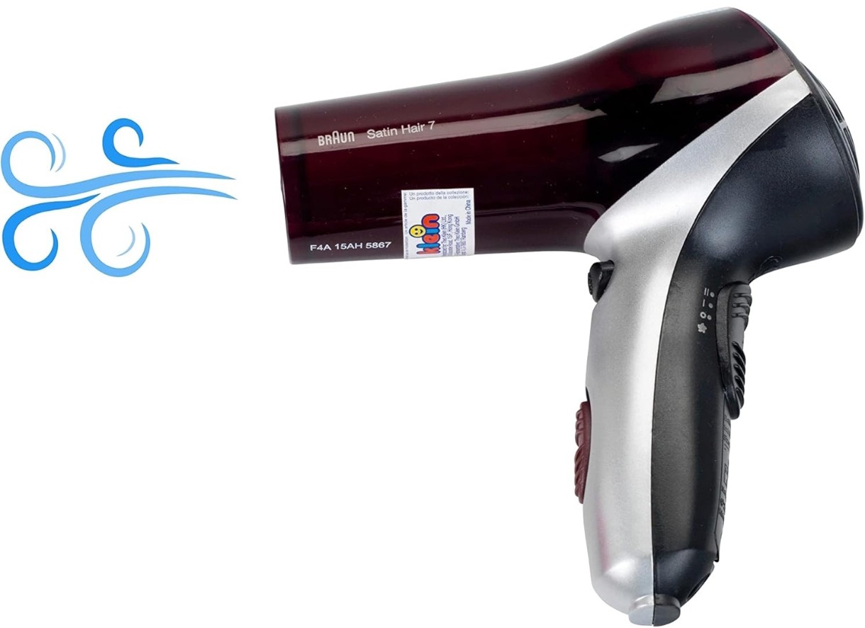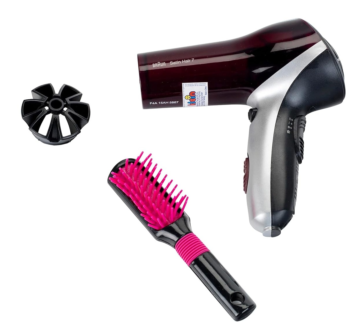 Acest uscător de păr pentru copii a fost creat sub licență Braun și arată exact ca un produs Braun real. Este negru cu accente roz închis și gri. Vine cu o perie moale, conturată și un vârf înlocuibil.