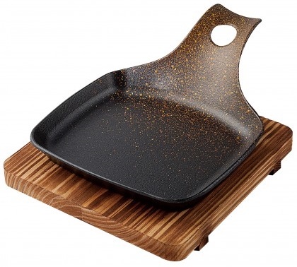 Platoul dreptunghiular din fontă de 26х20 cm pe un suport din lemn, este folosit pentru a servi bucatele calde atât în cafenele, restaurante, cât și acasă. Bucatele fiind servite într-un așa mod vor rămâne fierbinți și gustoase un timp îndelungat. Fonta este un material ecologic de o rezistență înaltă.