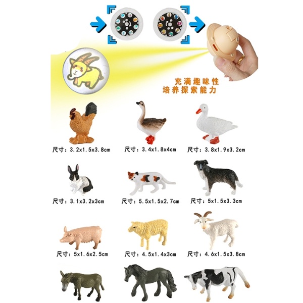 Setul include diverse animale domestice și un proiector care permite afișarea siluetelor lor pe perete sau tavan.