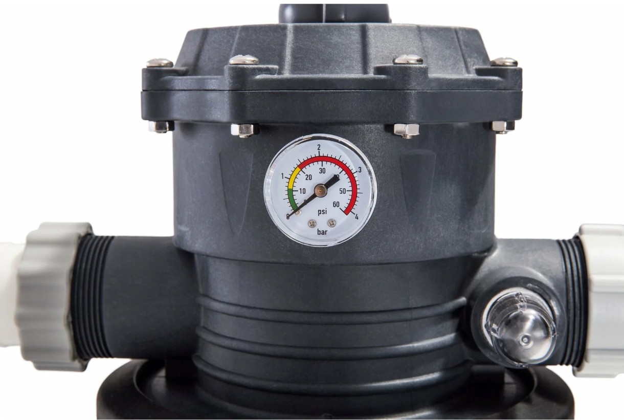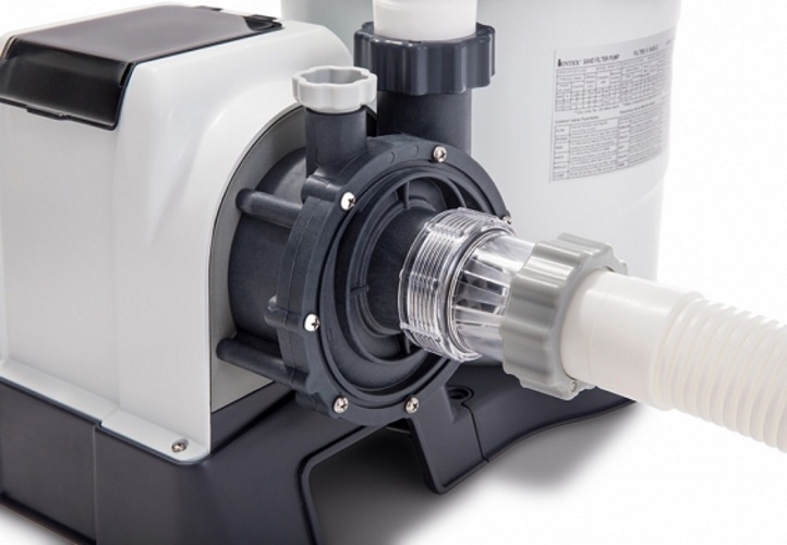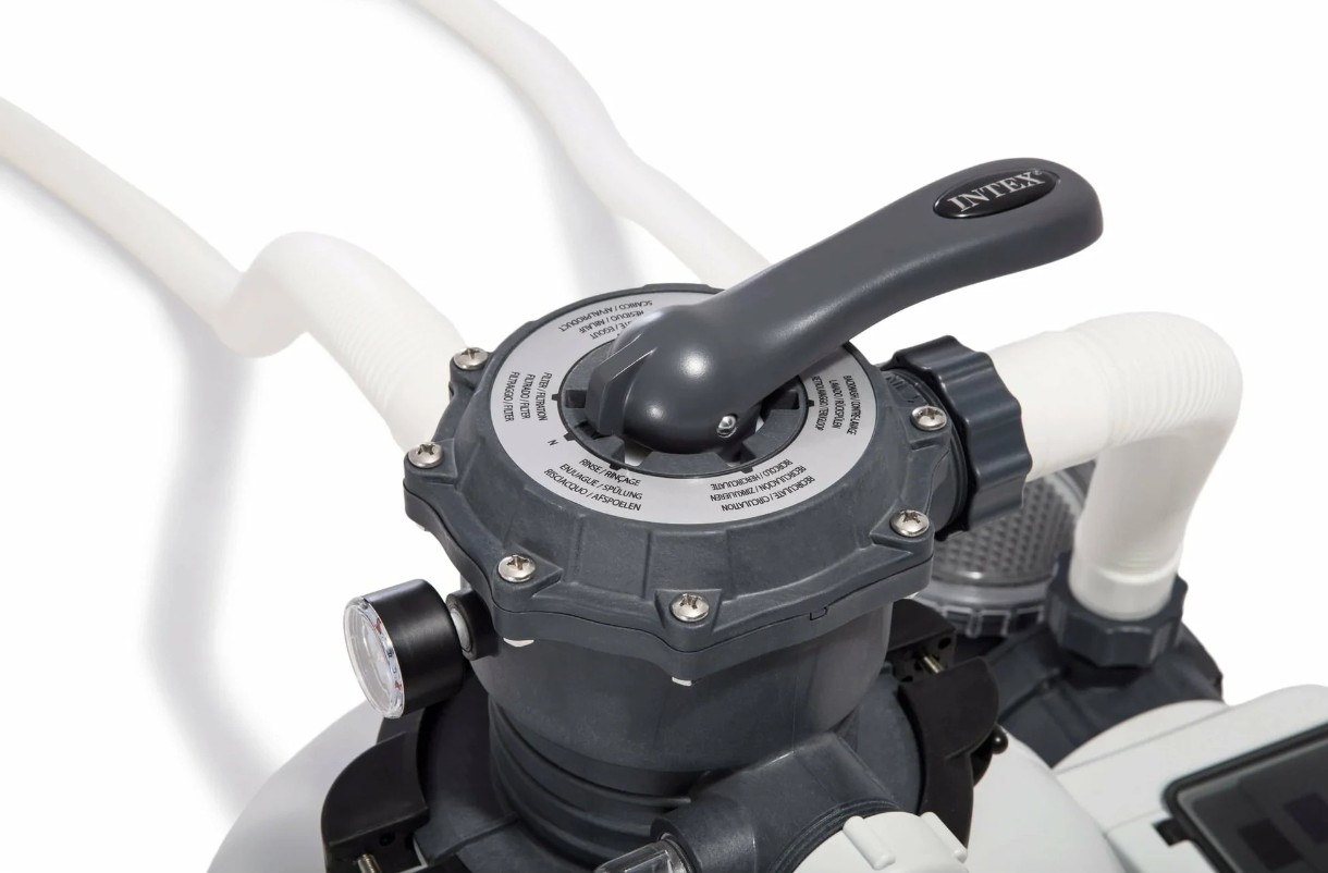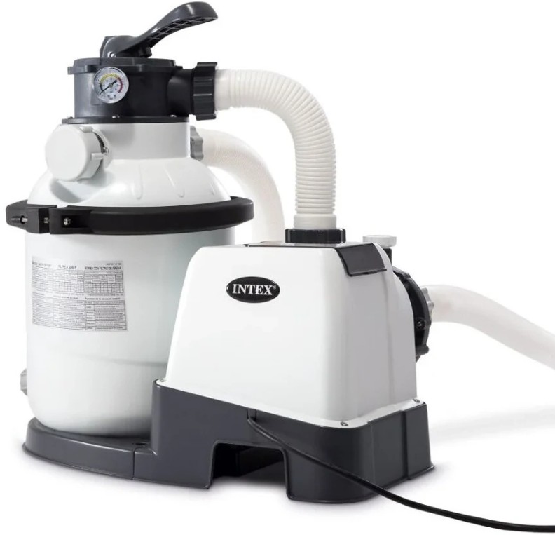 Pompă de apă cu o capacitate de 5700 l/h cu filtrare cu nisip «Intex Sand Filter Pump SX1500 26644 (28644, SF90220T)» pentru piscine gonflabile și cu cadru. Pompa are un design simplu, fiabil, cu izolație dublă și o supapă de aer, necesitând întreținere minimă. Este conectat la piscină cu două furtunuri, care sunt fixate în siguranță cu cuplaje. Nisipul de cuarț purificat este folosit pentru filtrarea apei, care purifică apa cu 30% mai eficient decât pompele cu cartuș și este schimbat la fiecare doi ani. Pentru confort, este echipat cu șase moduri de funcționare cu spălare în contra și un cronometru. Există un coș special cu skimmer pentru curățarea resturilor mari.