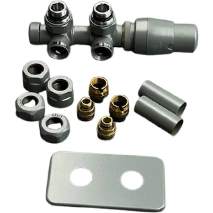 Setul Twins all in one — ventil termostatic unghiular pentru conectare, cu distanță între axe de 50 mm.
