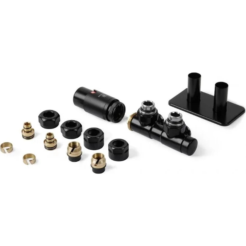 Setul Twins all in one — ventil termostatic unghiular pentru conectare, cu distanță între axe de 50 mm.