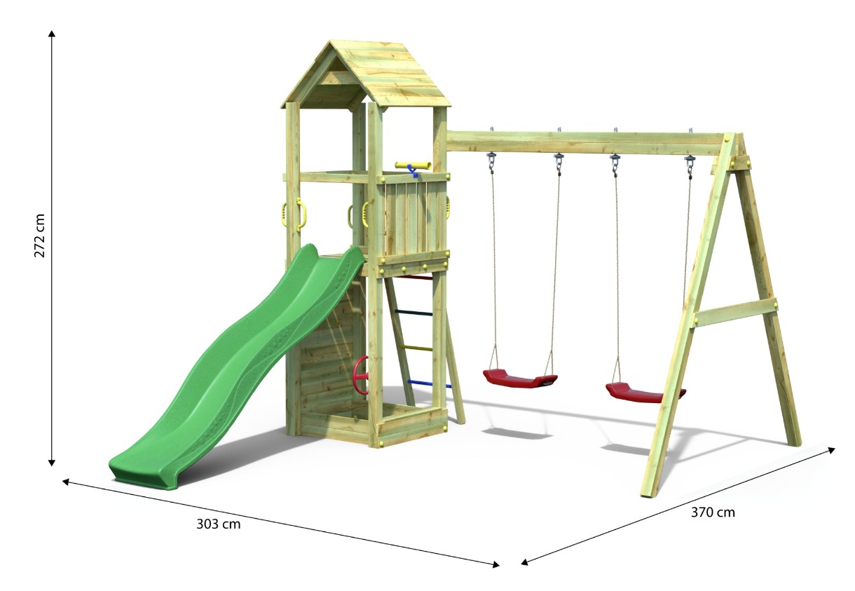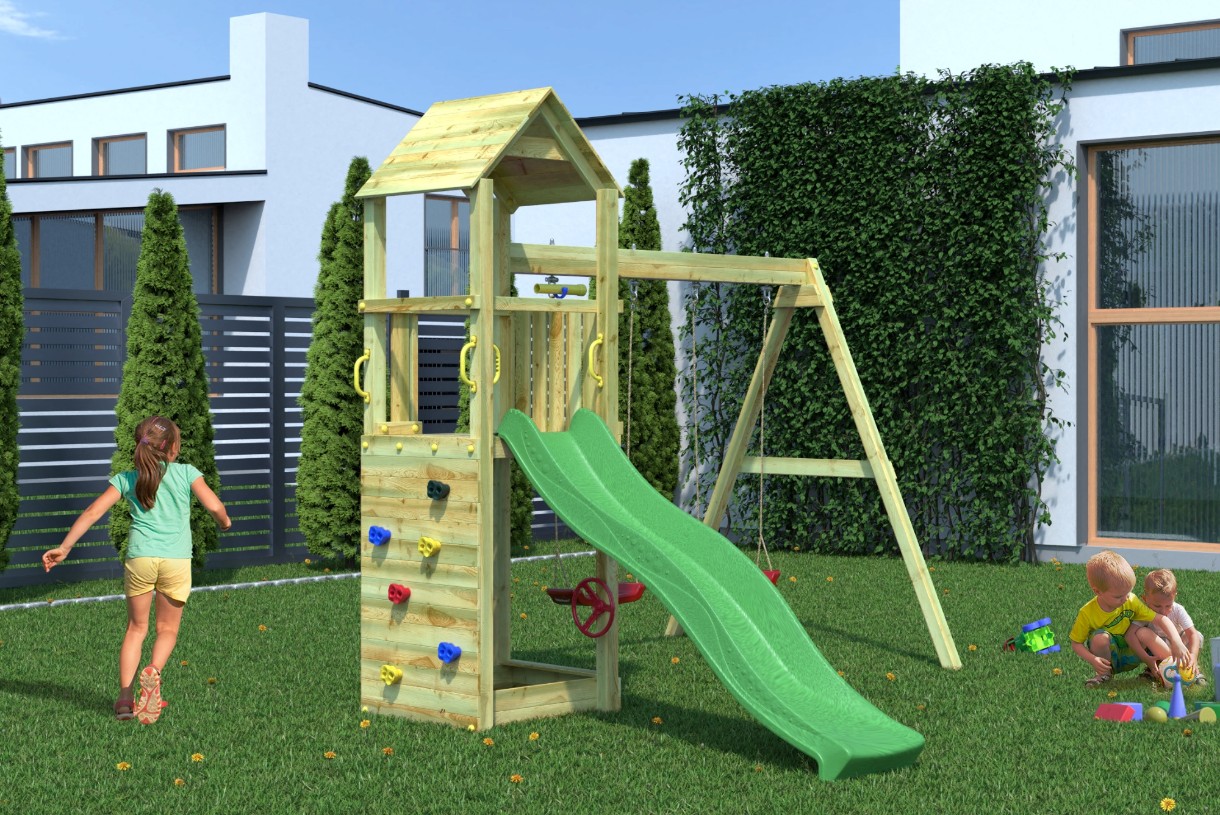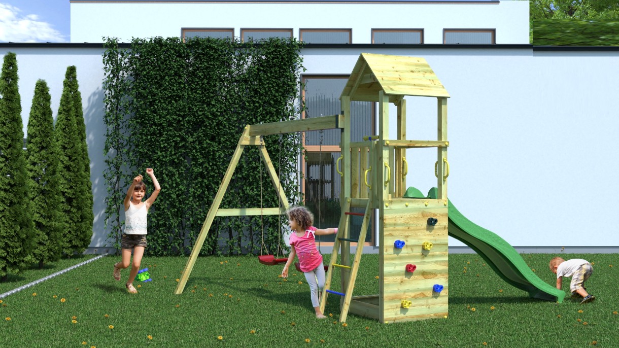 Creând seturile noastre, dorim să aducem bucurie pură, să lăsăm în memoria copiilor multe amintiri frumoase. FUNGOO FLAPPI este mai mult decât o simplă platformă. Este o garanție pentru un zâmbet pe fața fiecărui copil. Leagănele și toboganul îi vor oferi copilului multă mișcare. Accesoriile sub formă de telescop și volan își vor stimula imaginația. Peretele de cățărare va face urcarea pe scări mai puțin plictisitoare. Spațiul sub platforma locului de joacă pentru copii poate fi amenajat ca o cutie de nisip. Toate acestea sunt realizate din materiale solide și durabile, care nu își vor pierde aspectul și culoarea atrăgătoare pentru mult timp. Toate aceste elemente fac din FLAPPI o platformă de joacă ideală pentru orice grădină.