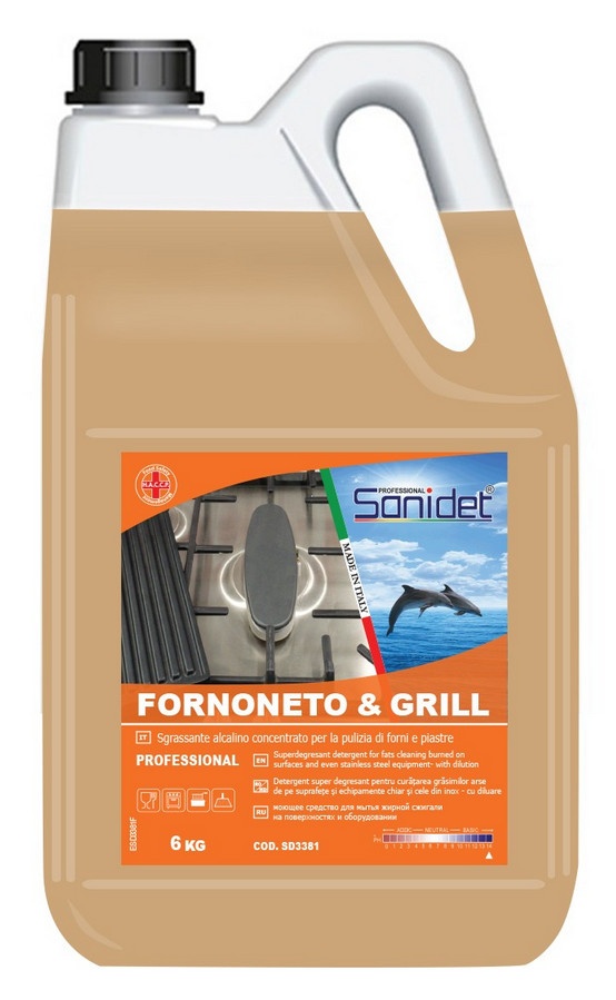 Detergent superdegresant alcalin, special conceput pentru îndepărtarea reziduurilor grăsimilor și alimentelor carbonizate de pe cuptoare, plite, hote, grătare, veselă, suprafeţe de gătit etc. Datorită formulei sale concentrate îndepartează eficient cele mai rezistente urme de grăsime carbonizată. FornoNeto&Grill este recomandat pentru planul de curăţenie si autocontrol H.A.C.C.P.