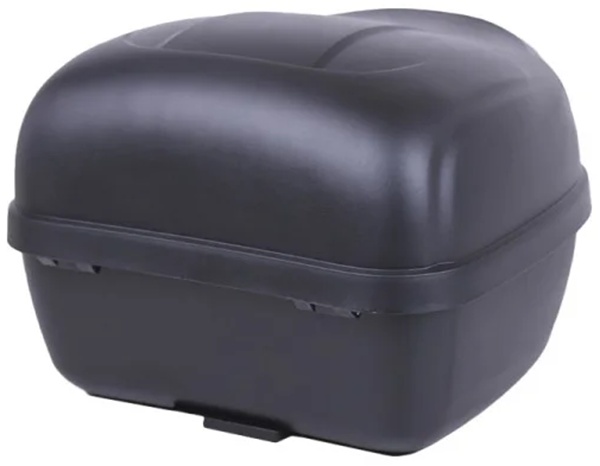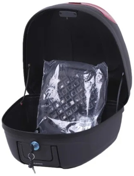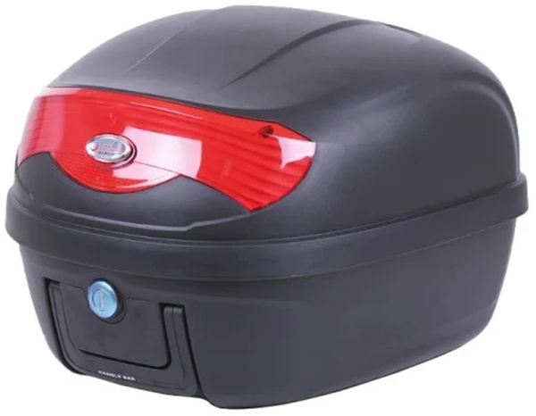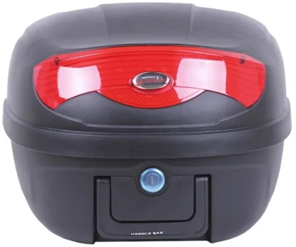 Top case YM‑0808 (V‑29L), dimensiuni 39,5×39,5×30,5 cm, este potrivit pentru montare pe scuter, motociclete ușoare și medii. Carcasa este realizată din plastic ABS durabil, rezistent la șocuri, crăpături și ciobiri. Suprafața mată se curăță ușor de murdărie. Volumul util este de 29 l, iar greutatea de doar 4 kg asigură transport facil și instalare simplă. Modelul este echipat cu reflector încorporat în partea din spate, încuietoare cu protecție anti‑efracție pe partea inferioară a portbagajului și mâner rabatabil pentru transport comod când este detașat; în poziția montată, mânerul este fixat stabil într-o cavitate specială. Portbagajul este etanș, protejând conținutul de apă și praf.