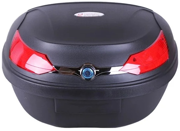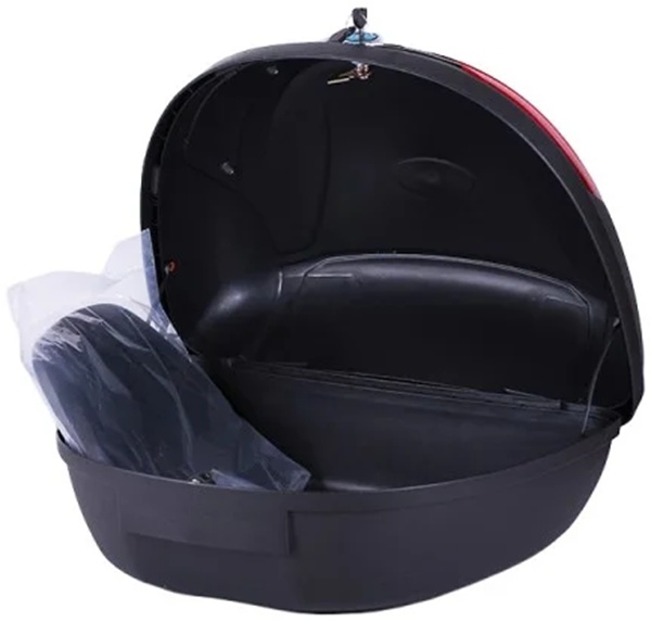 Top case YM‑0818 (V‑51L), dimensiuni 59,5×44×32 cm, este potrivit pentru montare pe scuter, motociclete ușoare și medii. Carcasa este realizată din plastic ABS durabil, rezistent la șocuri, crăpături și ciobiri, iar suprafața se curăță ușor de murdărie. Volumul util este de 51 l, iar greutatea de doar 4 kg asigură transport facil și instalare simplă. Modelul are un design elegant și este echipat cu reflector încorporat în partea din spate, încuietoare cu protecție anti‑efracție pe partea inferioară a portbagajului. Reflectoarele laterale asigură vizibilitate crescută pe timp de noapte, iar etanșeitatea portbagajului protejează conținutul de apă și praf.