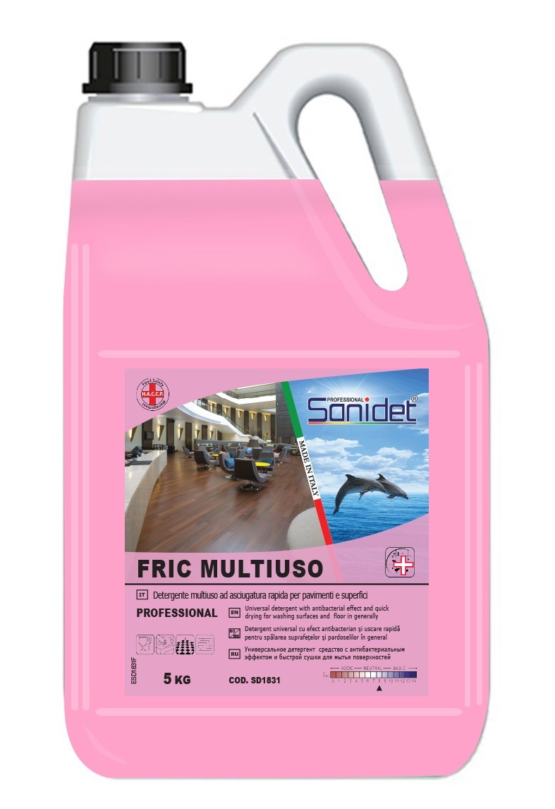 Detergent universal, multiuz cu efect antibacterian şi uscare rapidă curăţă şi degresează în profunzime toate tipurile de suprafeţe rezistente la umiditate. După spălarea suprafeţelor, acestea rămân curate si igienizate. “Fric Multiuso“ nu lasă reziduri după spălare şi de aceea, nu necesită clătire, dar daca este necesar puteti clati suprafata inainte de a o utiliza. Datorită pH neutru, “Fric Multiuso” nu deteriorează suprafeţele. Este recomandat pentru curăţarea şi degresarea zilnică a suprafeţelor de orice tip şi în orice domeniu de activitate. Adecvat pentru planul de curăţenie şi autocontrol H.A.C.C.P.