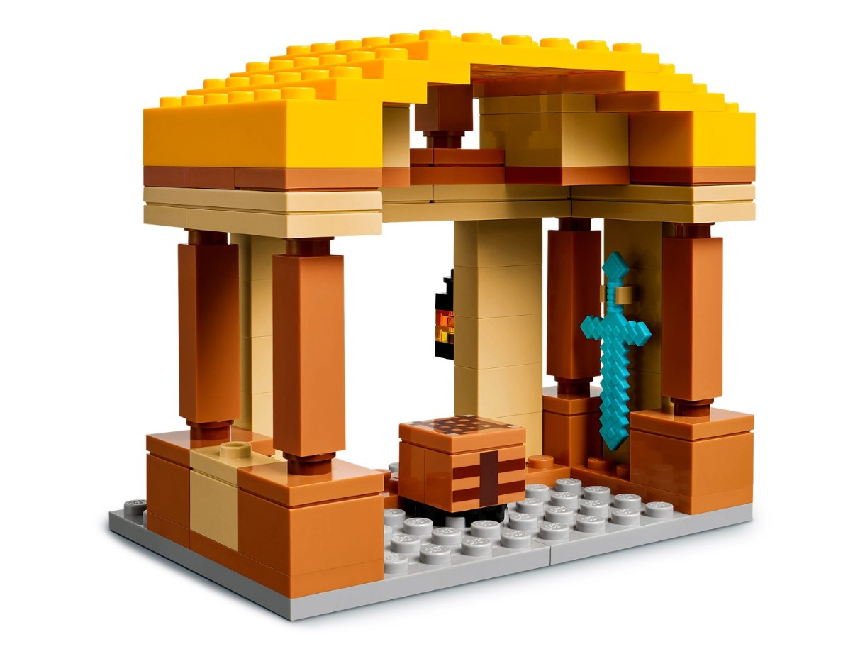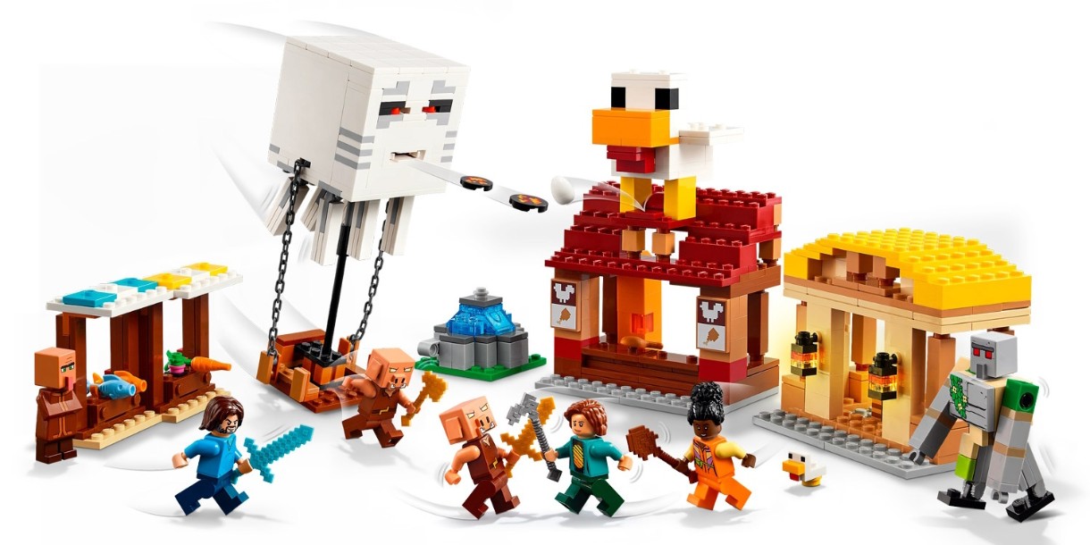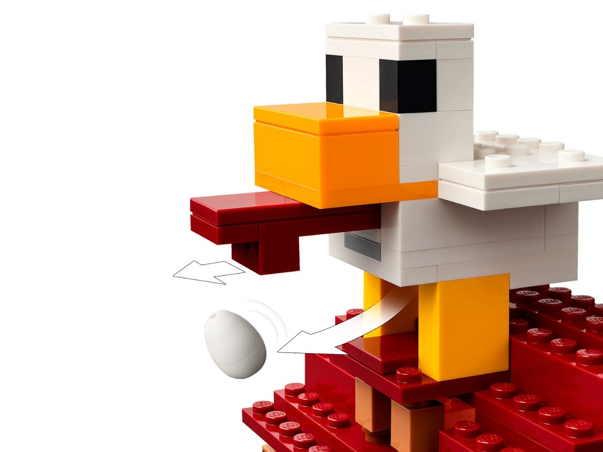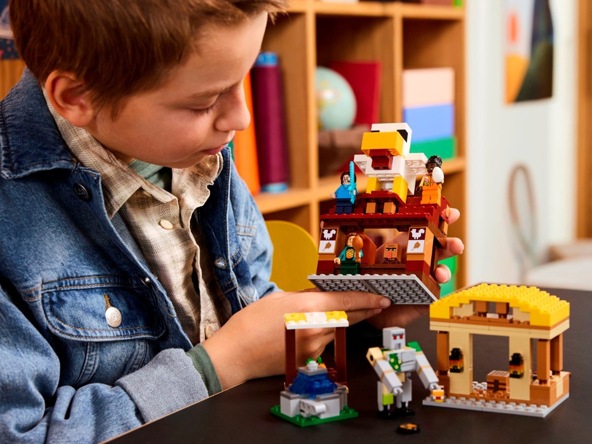 Setul conține personaje populare din jocuri video: Steve, Natalie, Don, doi purceluși, un balon fantomă, un sătean, o găină și o figurină golem de fier. Balonul cu aer cald are loc pentru porci și un lansator de discuri. Satul include tarabe de piață, restaurantul cu pui prăjit al lui Steve, atelierul său de meșteșuguri și o fântână pe care copiii o pot „umfla” folosind o funcție încorporată. Un model mare de găină se află pe acoperișul restaurantului, inclusiv o funcție distractivă de depunere de ouă. Pentru distracție digitală, aplicația LEGO Builder le permite copiilor să mărească imaginea, să rotească modelele în 3D și să-și urmărească progresul.
