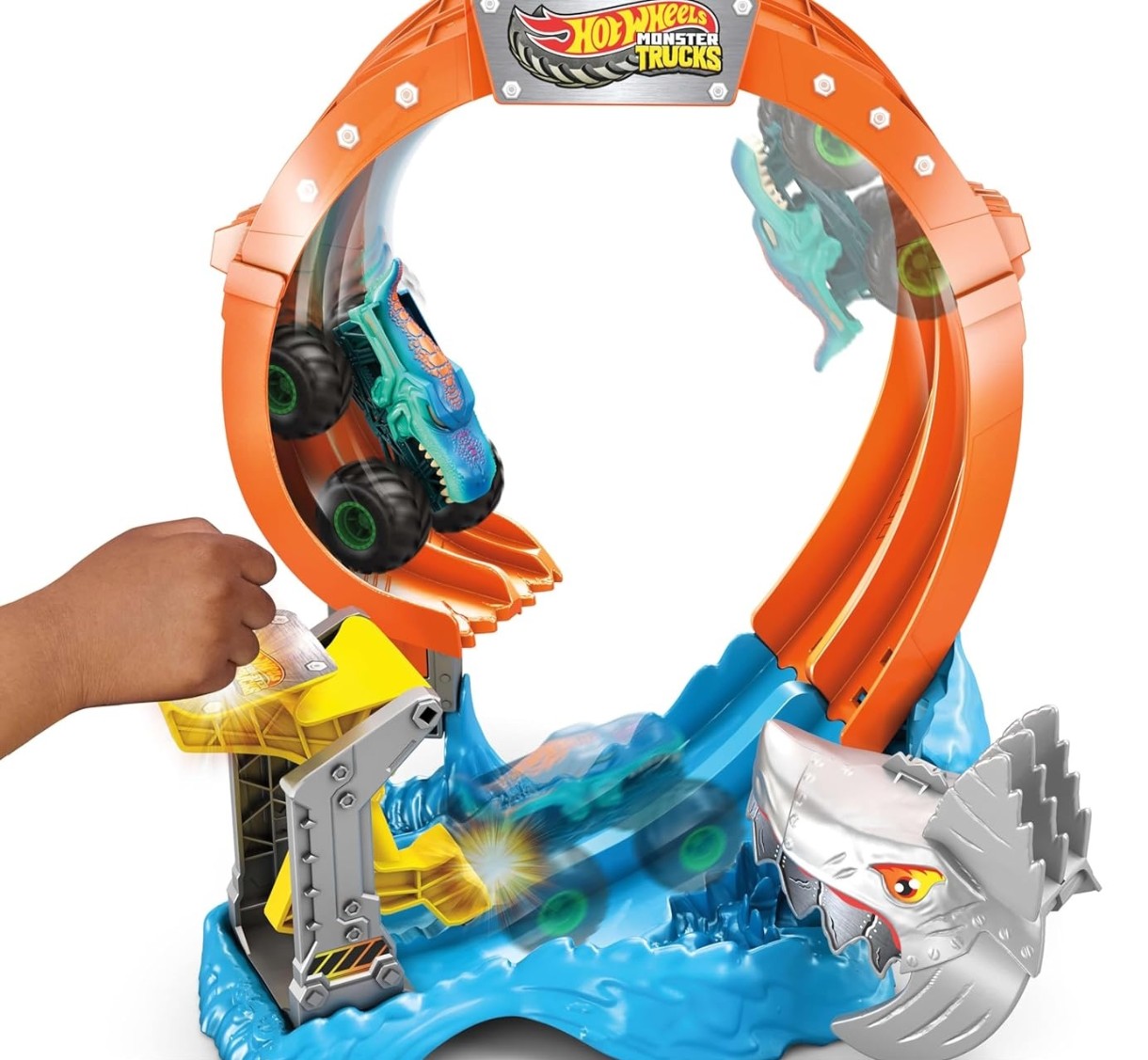 Plasează camionul Mega-Wrex la scară 1:64 în lansator și trimite-l într-o spirală amețitoare. Cu suficientă forță, va traversa bucla și va doborî rechinul, rupând pista în două. Dacă lansarea este prea slabă, camionul va fi prins în gura monstrului!