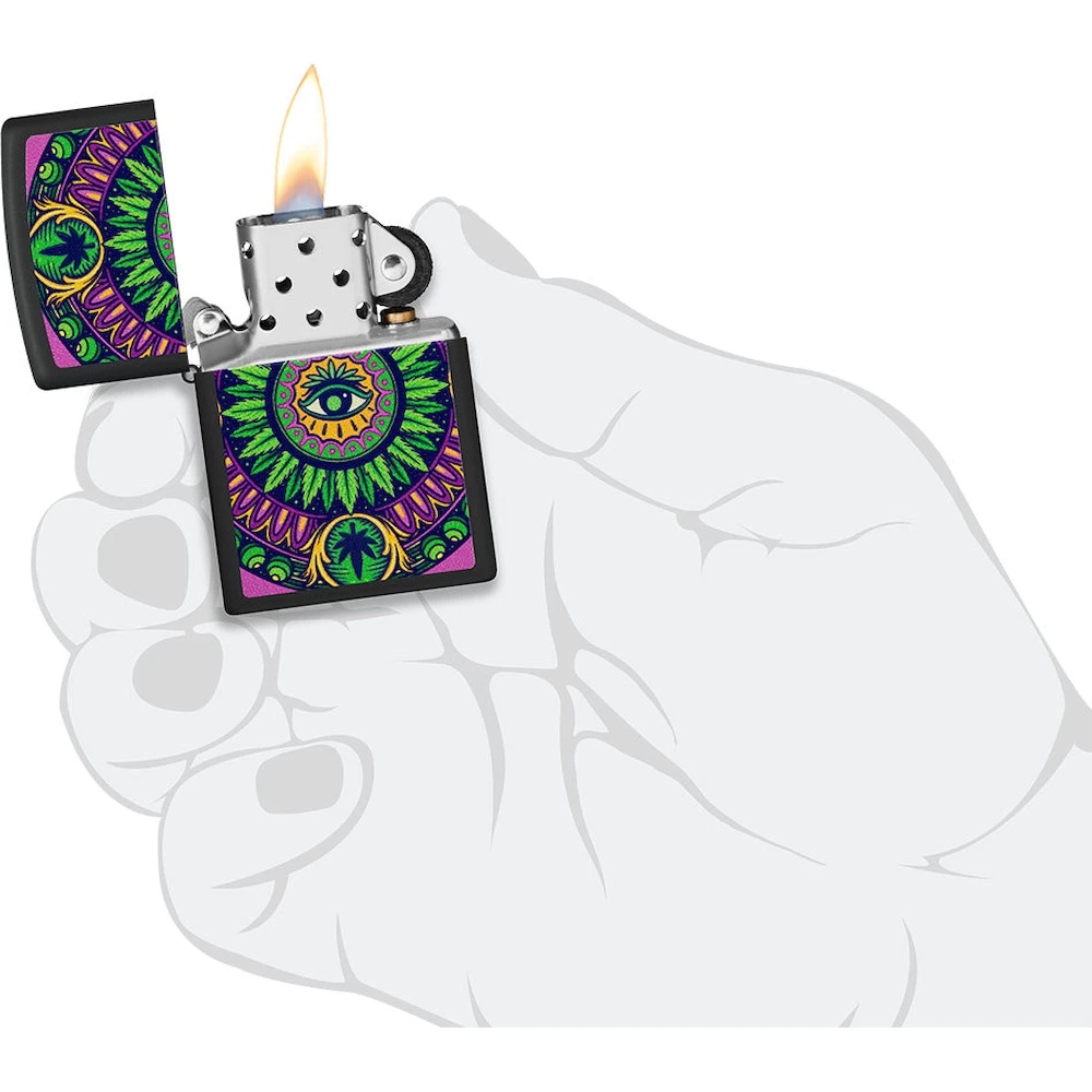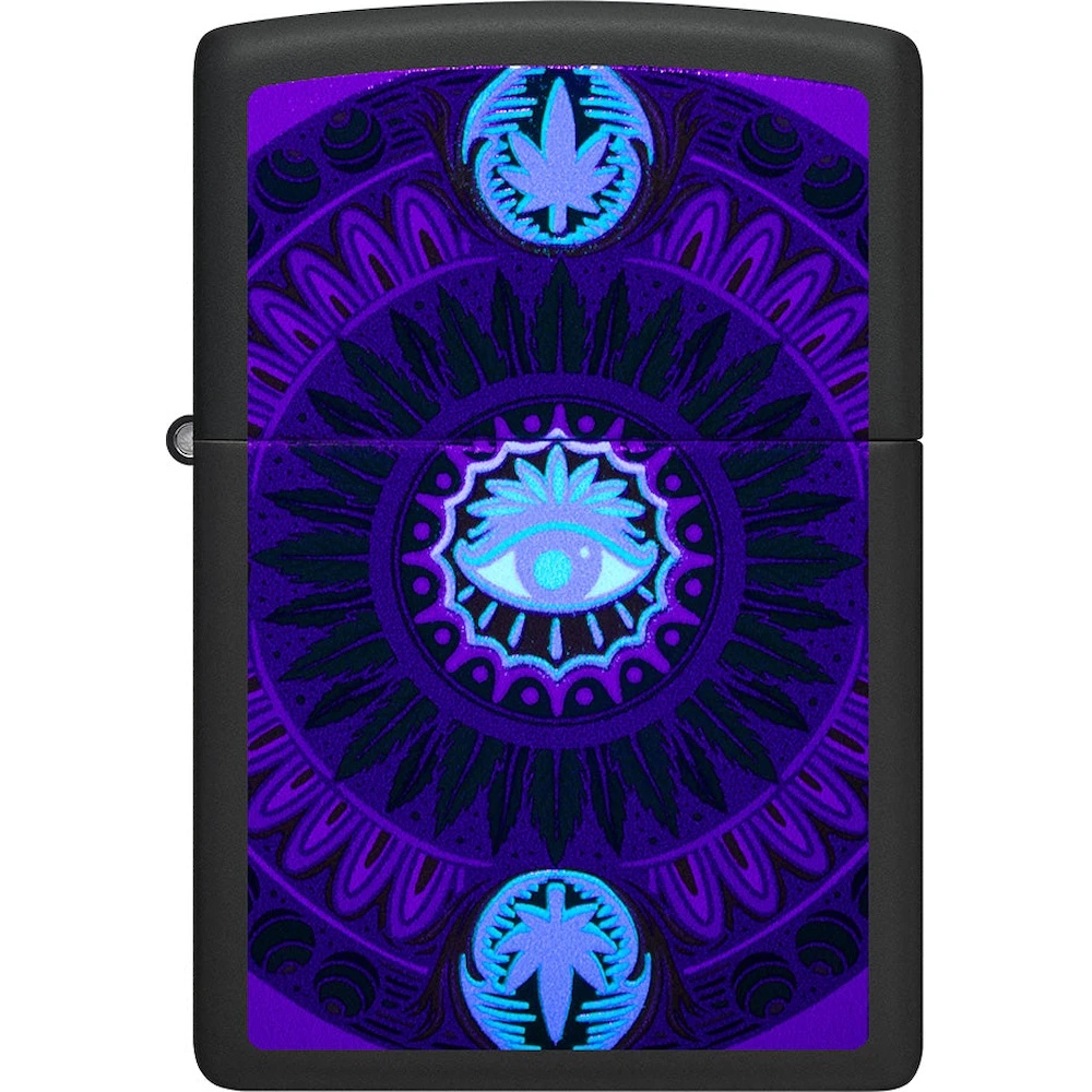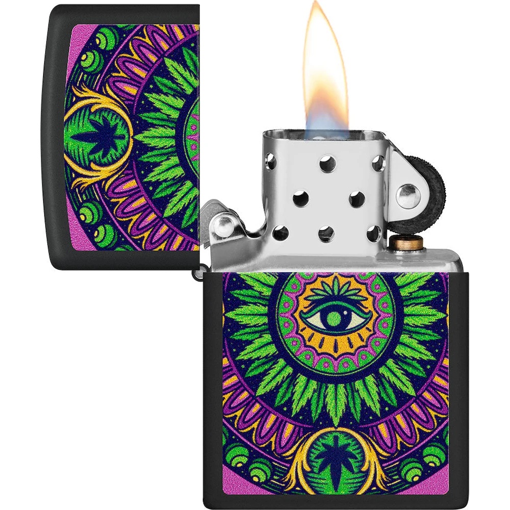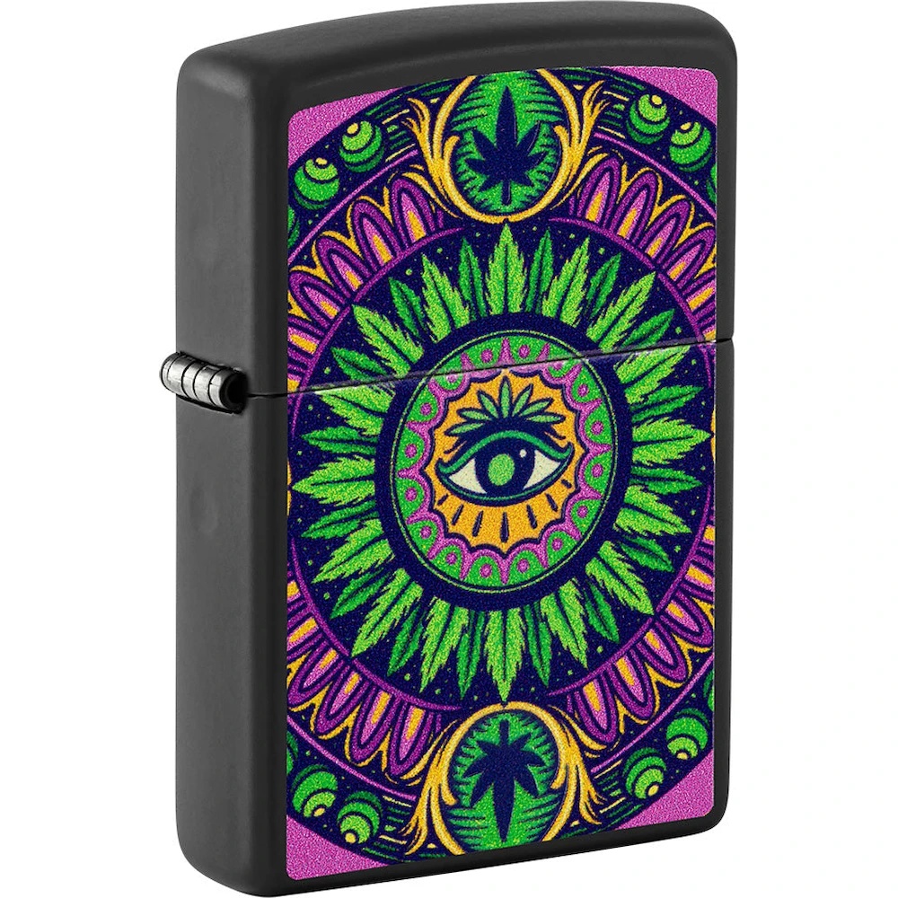 Zippo 48583 Cannabis Pattern Design este o brichetă originală cu un design captivant, care prezintă un model distinctiv de frunze de cannabis și un ochi simbolic în centrul designului. Această brichetă are un efect special – detaliile sale strălucesc în întuneric, oferind un aspect impresionant și vibrant în condiții de lumină scăzută.