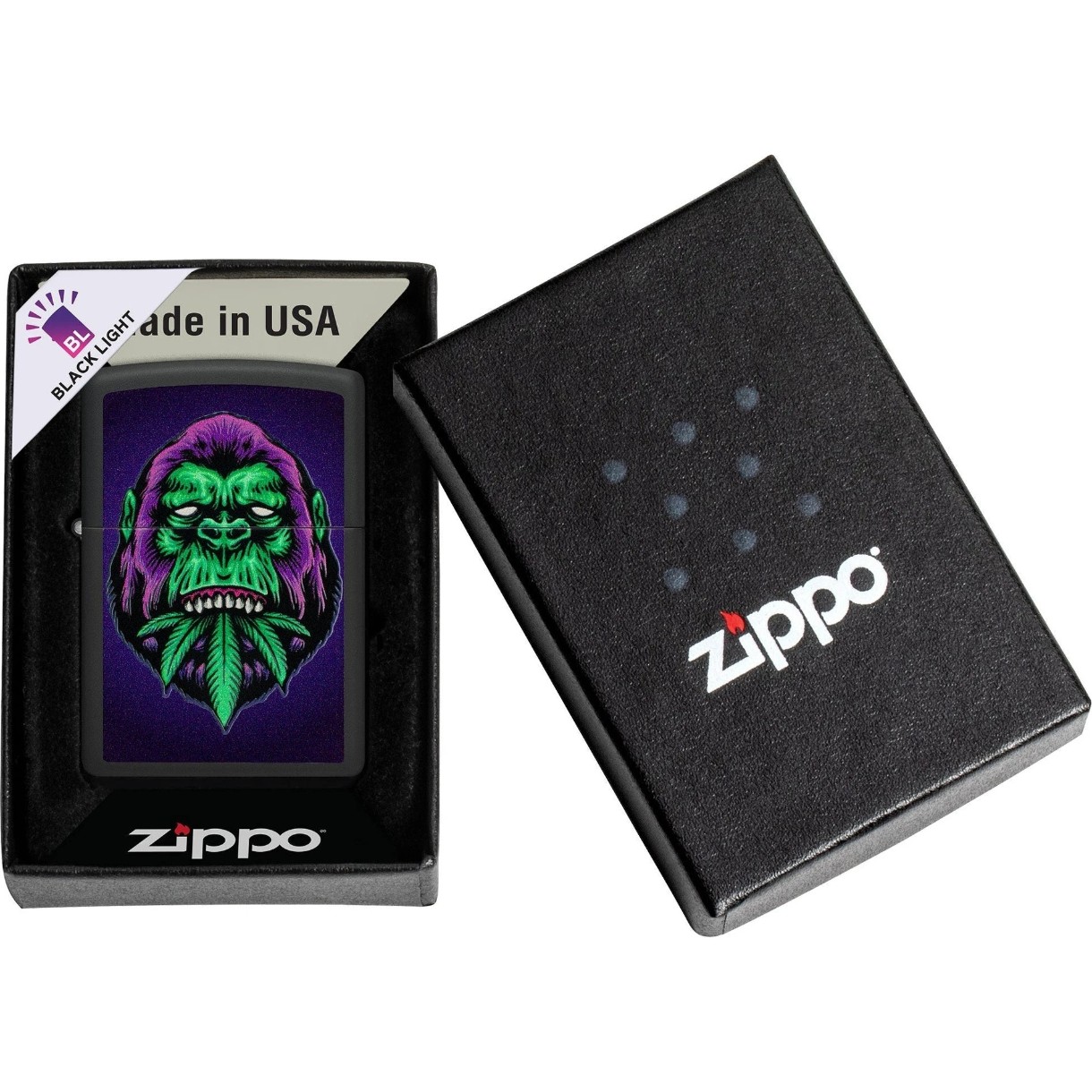 Această brichetă Zippo captivantă prezintă o gorilă impunătoare din cânepă, care strălucește sub lumina neagră și atrage toate privirile. Imaginea puternică simbolizează forța, conexiunea cu natura și o anumită sălbăticie. Datorită detaliilor minuțios pictate și efectului de strălucire în lumina ultravioletă, designul prinde viață, oferind un aspect impresionant. Funcția de lumină neagră adaugă o dimensiune suplimentară motivului, transformând bricheta într-un adevărat punct de atracție pentru cei care apreciază combinația unică dintre artă, natură și tehnologie.