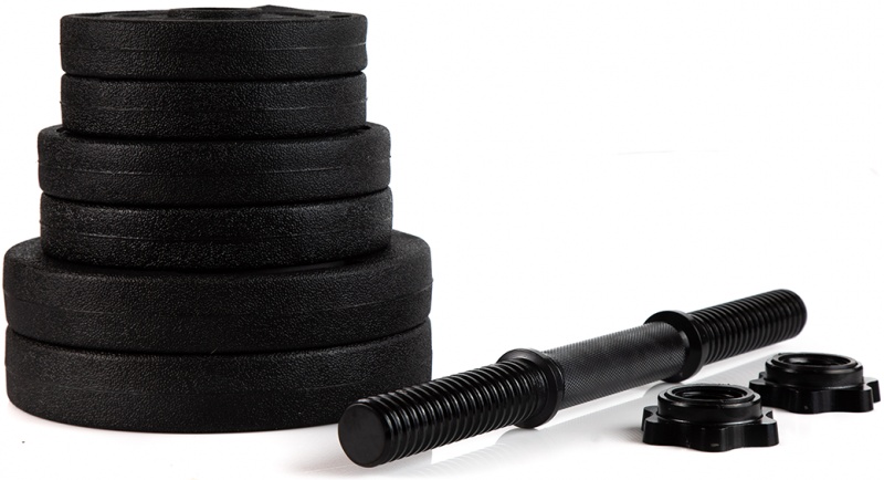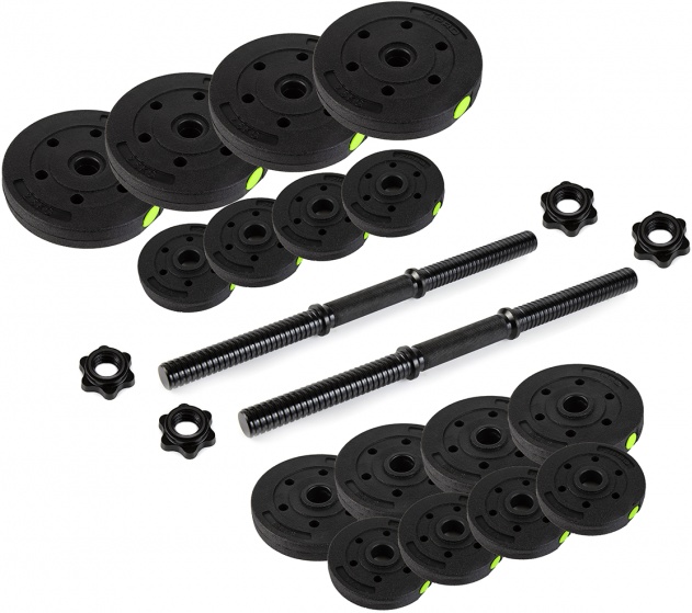 Gantere Zipro, formate din două tije scurte de oțel de 40 cm și o greutate totală de 20 kg. Plăcile sunt realizate din ciment acoperit cu un strat de plastic care reține baza în caz de cădere și pliere la capătul rândului.