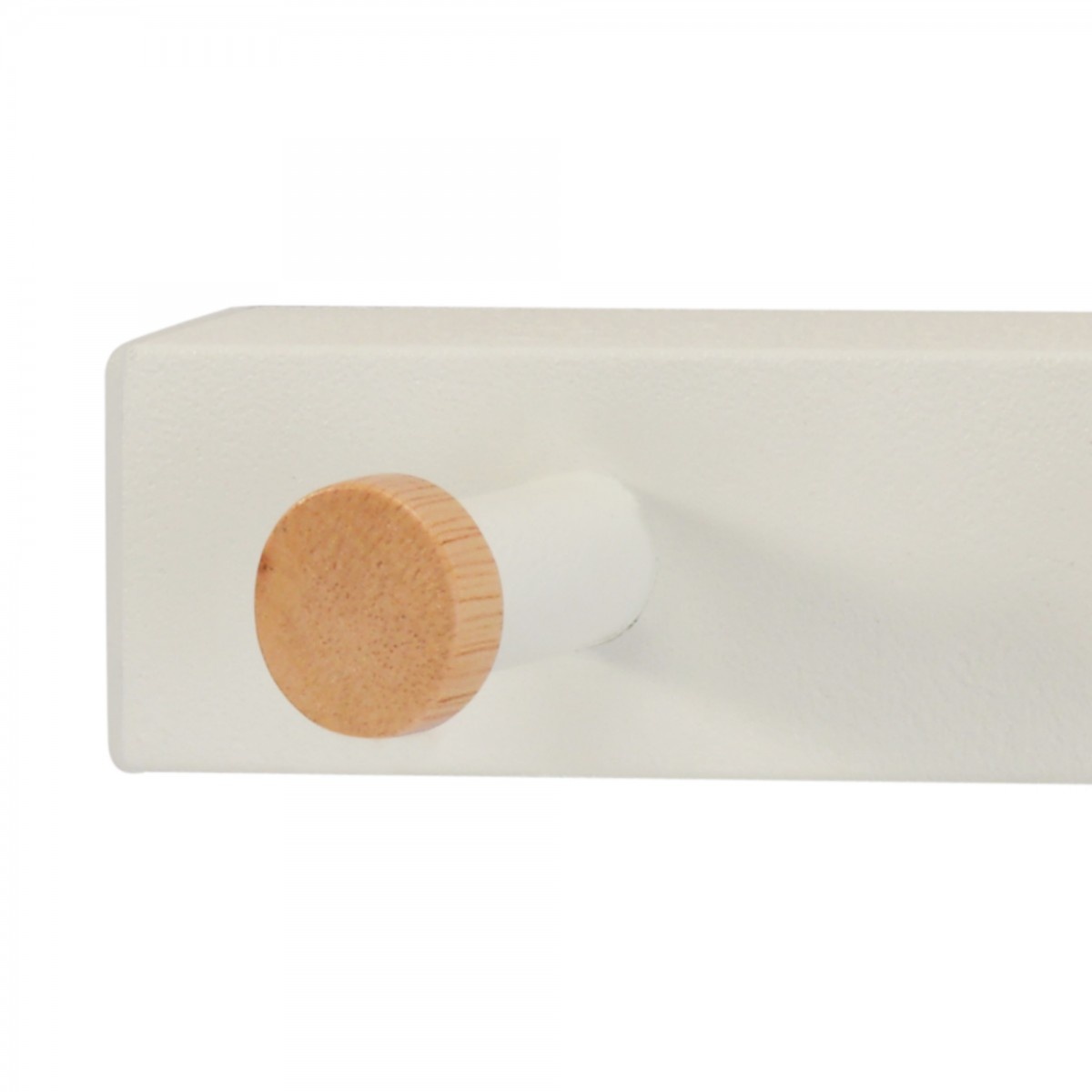 Cuier de perete orizontal, realizat din metal vopsit electrostatic. Echipat cu 3 agățători metalice cu elemente din lemn lăcuit.
