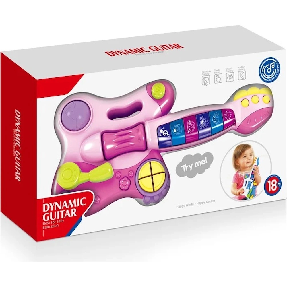 Jucăria este prevăzută cu butoane funcționale care declanșează sunete și melodii, contribuind la dezvoltarea auzului muzical, a coordonării mână–ochi și a motricității fine. Fiind ușor de ținut și manevrat, chitara stimulează creativitatea și jocul de rol, oferind o experiență distractivă și educativă în același timp.