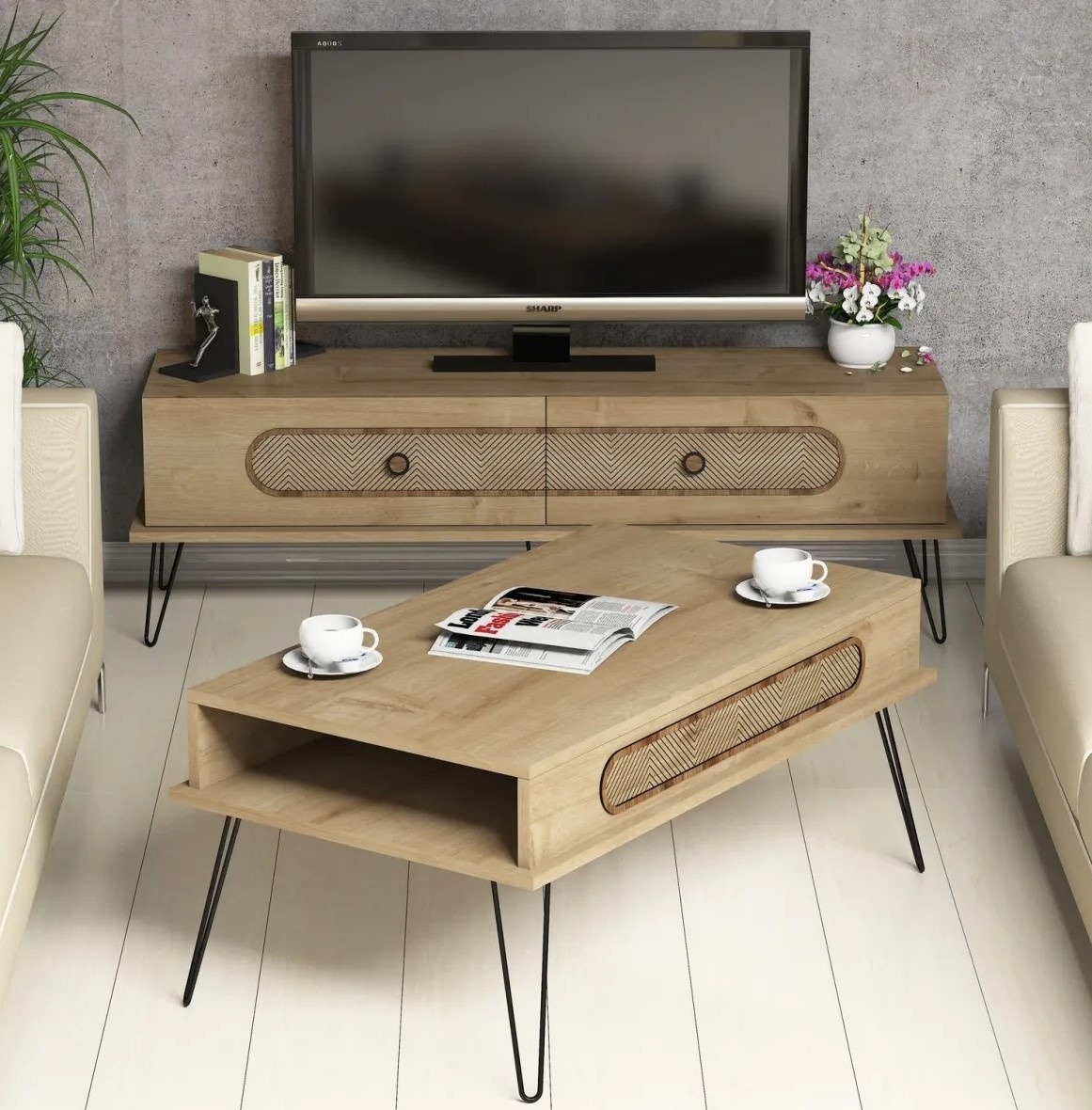 Unitatea tv dispune de numeroase rafturi, permițându-vă să organizați în mod ordonat dispozitive media, cărți și obiecte decorative. Măsuța de cafea oferă o suprafață generoasă pentru băuturi, gustări și reviste. Ambele piese pot fi fixate pe perete pentru un plus de stabilitate și siguranță.