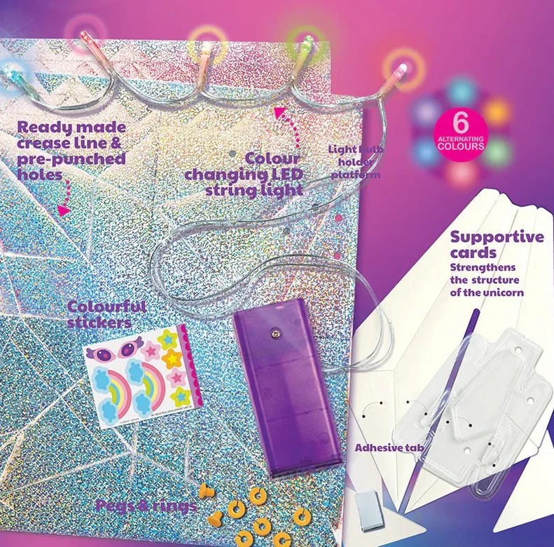In sethârtie cu sclipici cu linii de pliere și găuri, foaie de autocolante, lumini cu LED-uri în 6 culori, chei și inele, urechi de sprijin, bandă adezivă