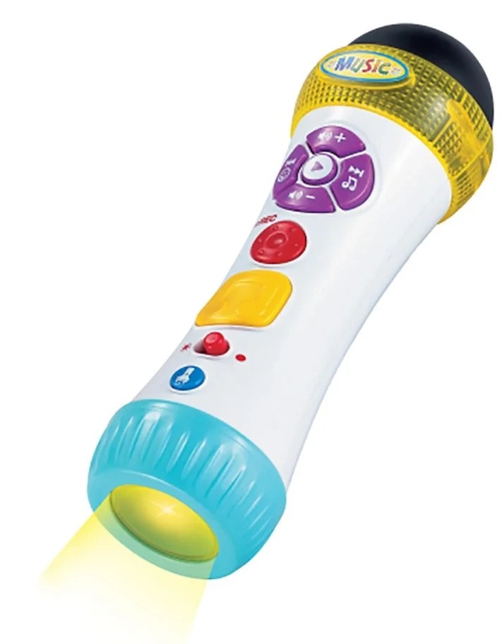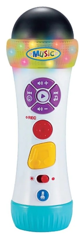 Microfonul muzical cu efecte sonore, melodii si lumini iti permite sa-ti inregistrezi vocea si sa asculti apoi inregistrarea! In plus, poti sa-i reglezi volumul, sa asculti meldoii si sa-l folosesti pe post de lanterna! Iar daca nu te joci cu el mai mult de 50 de secunde, se opreste singur!