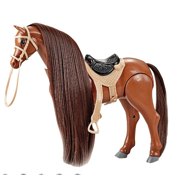 Calul de jucărie are un aspect realist, cu cap mobil, coamă și coadă care pot fi pieptănate. Setul include accesorii pentru echitație — șa, frâu, perie pentru îngrijire și elemente decorative.