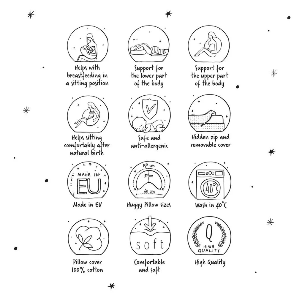 Perna Huggy este un produs multifuncțional, economic, care răspunde cerințelor celor care caută soluții practice, confortabile și compacte. Aceasta se potrivește perfect stilului de viață dinamic al femeilor moderne. Datorită ergonomiei sale, dimensiunii și calității de fabricație, este ideală și pentru călătorii. Perna cu întreținere ușoară vine cu un huse detasabilă din tricot din bumbac plăcut la atingere și umplutură din bile de poliester.