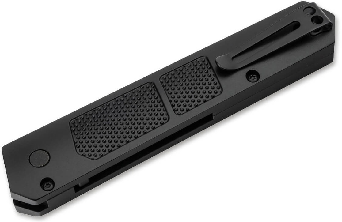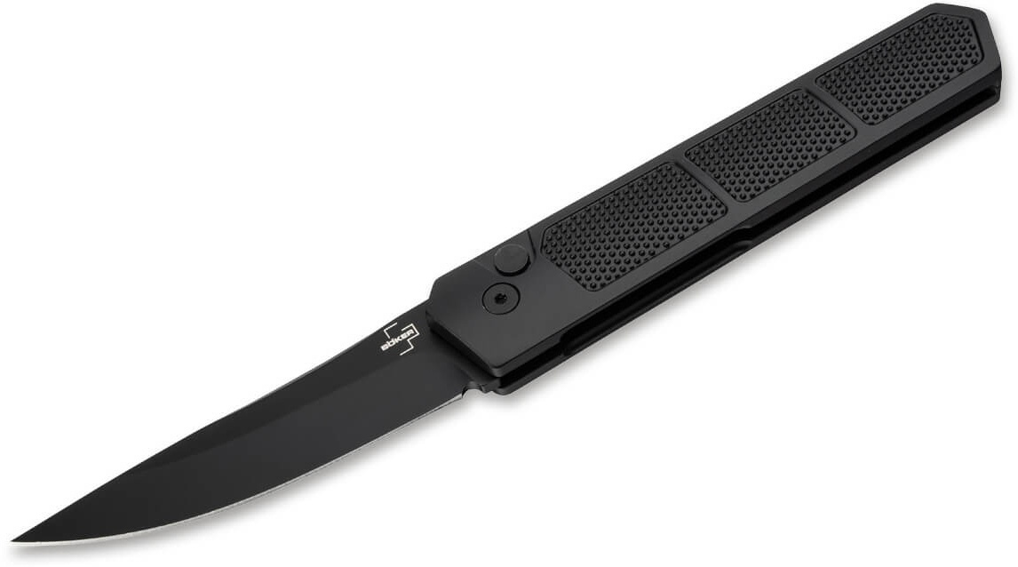 Cuțitul Böker Plus Kwaiken Grip Auto Black 01BO474 este un model automat din seria Kwaiken, proiectat de Lucas Burnley. Lama este realizată din oțel D2, cunoscut pentru retenția bună a tăișului și rezistența la uzură. Mânerul din aluminiu are o textură antiderapantă pentru prindere sigură. Mecanismul automat cu buton permite deschiderea rapidă a lamei. Designul este subțire și modern, potrivit pentru purtare EDC. Cuțitul are clips pentru transport zilnic și teacă de protecție. Este un model gândit pentru utilizare tactică ușoară și purtare zilnică.