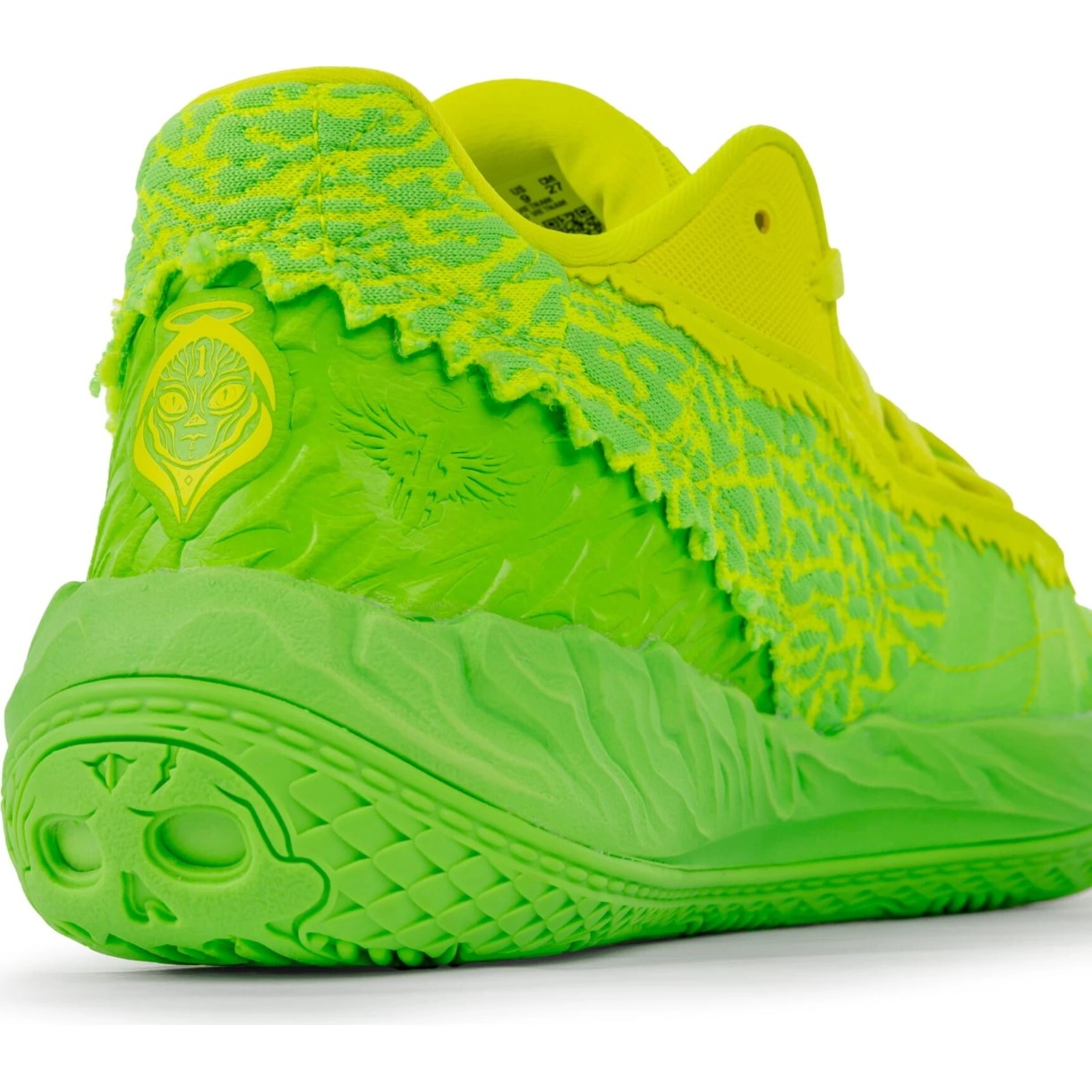 Talpa moale din material textil adaugă confort în timpul jocurilor prelungite, iar inserția decorativă din tricot de pe partea din spate subliniază stilul distinctiv al modelului. Desenele cu craniu, sârmă ghimpată și cifra „1” pe talpă, împreună cu inscripția „Not from here” pe limbă, reflectă caracterul lui LaMelo Ball și stilul său unic de joc.