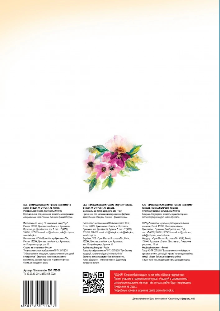 Hârtia pentru acuarelă din seria „Școala creativității” este o hârtie de înaltă calitate pentru desen. Este destinată picturii cu acuarele și guașă, fiind potrivită și pentru creioane, pasteluri și alte materiale artistice moi.