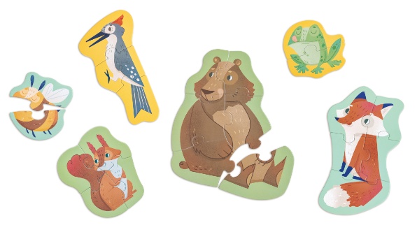Acest set de 10 puzzle-uri adorabile îi familiarizează pe cei mici cu animalele din pădure: albină, căprioară, vulpe, ciocănitoare, broască, urs, bufniță, veveriță, lup și arici.