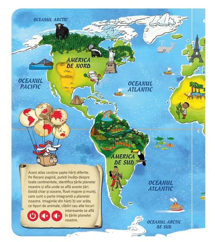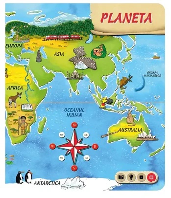 Cu ajutorul acestei carti copiii se pot familiariza cu toate continentele si oceanele lumii, pot afla numele tuturor tarilor, a capitalelor lor si atractiile regiunilor respective. La finalul fiecarei categorii copiii vor putea efectua teste de verificare a cunostintelor dobandite, ajutand astfel la memorarea eficienta si usoara a noilor informatii.