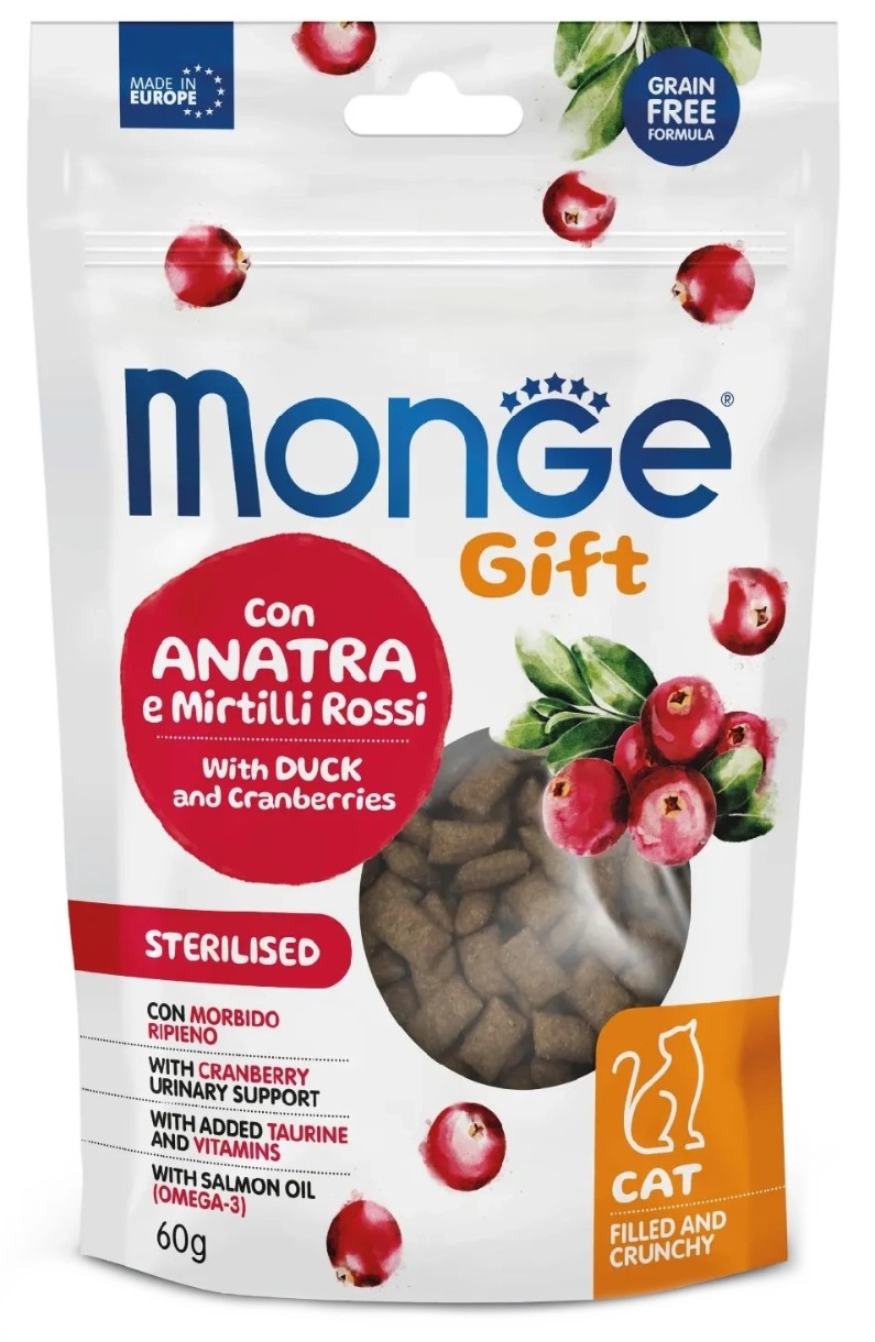 MONGE GIFT STERILISED FOOD WITH CRANBERRIES - pernuțe crocante cu rață și merișoare - este un hrană complementară pentru pisicile adulte sterilizate. Special concepută pentru bunăstarea pisicii dumneavoastră, datorită stratului exterior crocant care susține igiena dentară și umpluturii moi cu merișoare pentru a susține tractul urinar. Produsul este creat fără cereale și cu rață pentru a optimiza palatabilitatea și digestibilitatea hranei. Formula este îmbogățită cu taurină pentru a menține acuitatea vizuală și funcția cardiacă normală, precum și cu vitamine pentru vigilență zilnică. Includerea ingredientelor funcționale precum merișoare pentru a susține tractul urinar, drojdie de bere pentru a susține sistemul de apărare al organismului și ulei de somon, o sursă de omega-3, este rezultatul cercetării „Made in Italy”. Fără adaos de conservanți artificiali și zahăr.