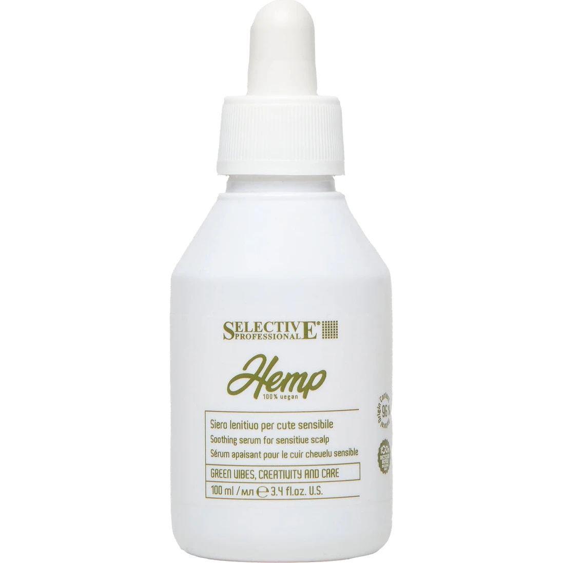 Ser pentru păr Selective Professional Hemp Lenitive Serum — produs concentrat pentru calmarea scalpului și îngrijirea intensă a pielii sensibile și iritate a capului.