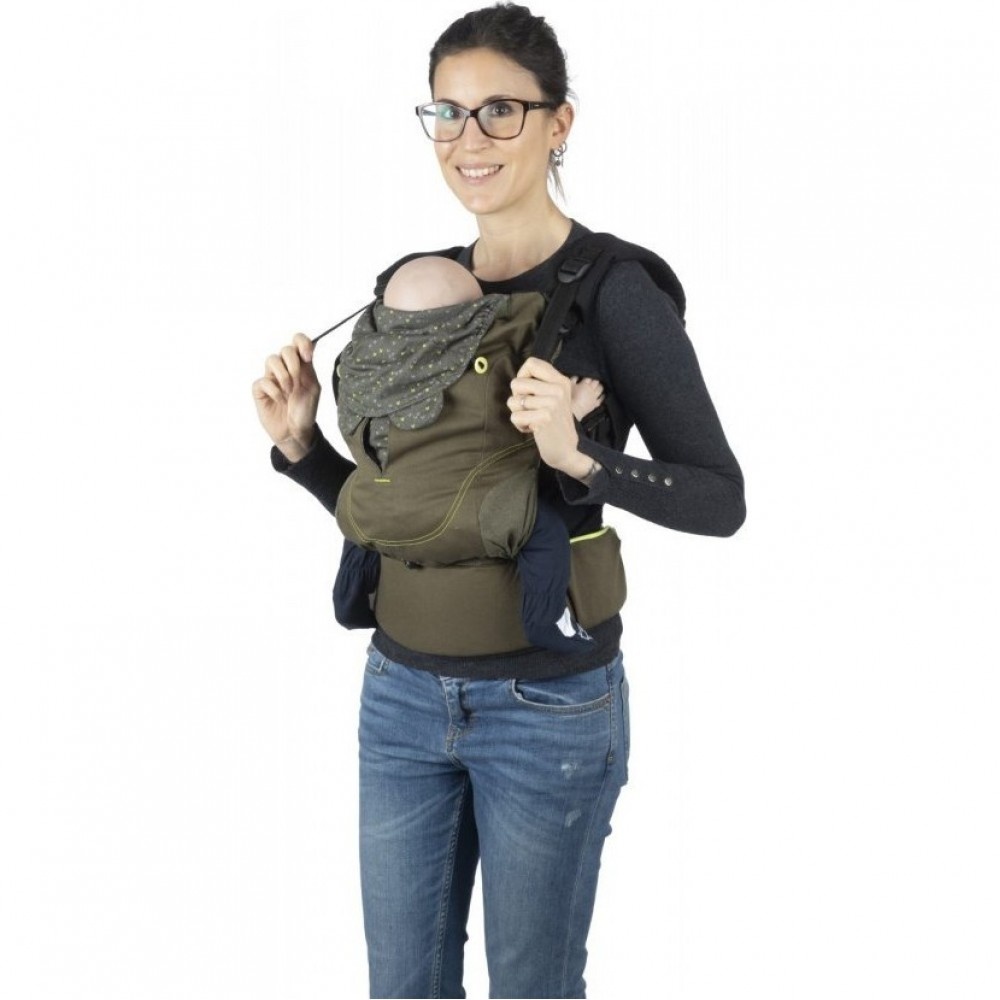 - 0+ Față către părinte. Poziția frontală este ideală pentru nou-născuți* deoarece permite un contact constant cu părintele, esențial în primele luni de viață*. *Pentru nou-născuți până la 3,9 kg este totuși recomandată o evaluare a tonicității musculare și a posturii de către un expert medical/sanitar sau un Babywearing Educator®.
