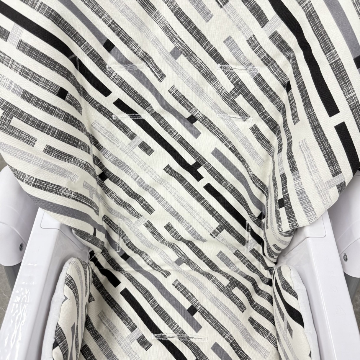 De multe ori, producătorii includ huse din material plastic, dar în timpul mesei spatele bebelușului transpiră, ceea ce poate provoca alergii. Din grijă pentru cei mici, am creat un model universal de husă detașabilă, confecționată din țesătură duck (70% bumbac și 30% poliester). Țesătura are o impregnare hidrofugă hipoalergenică, care nu irită pielea copilului.