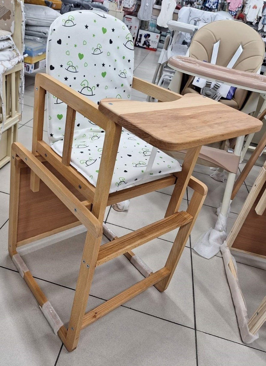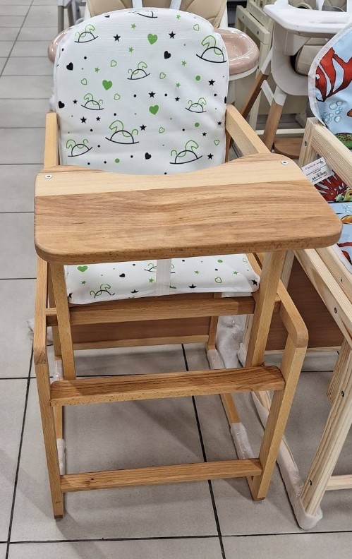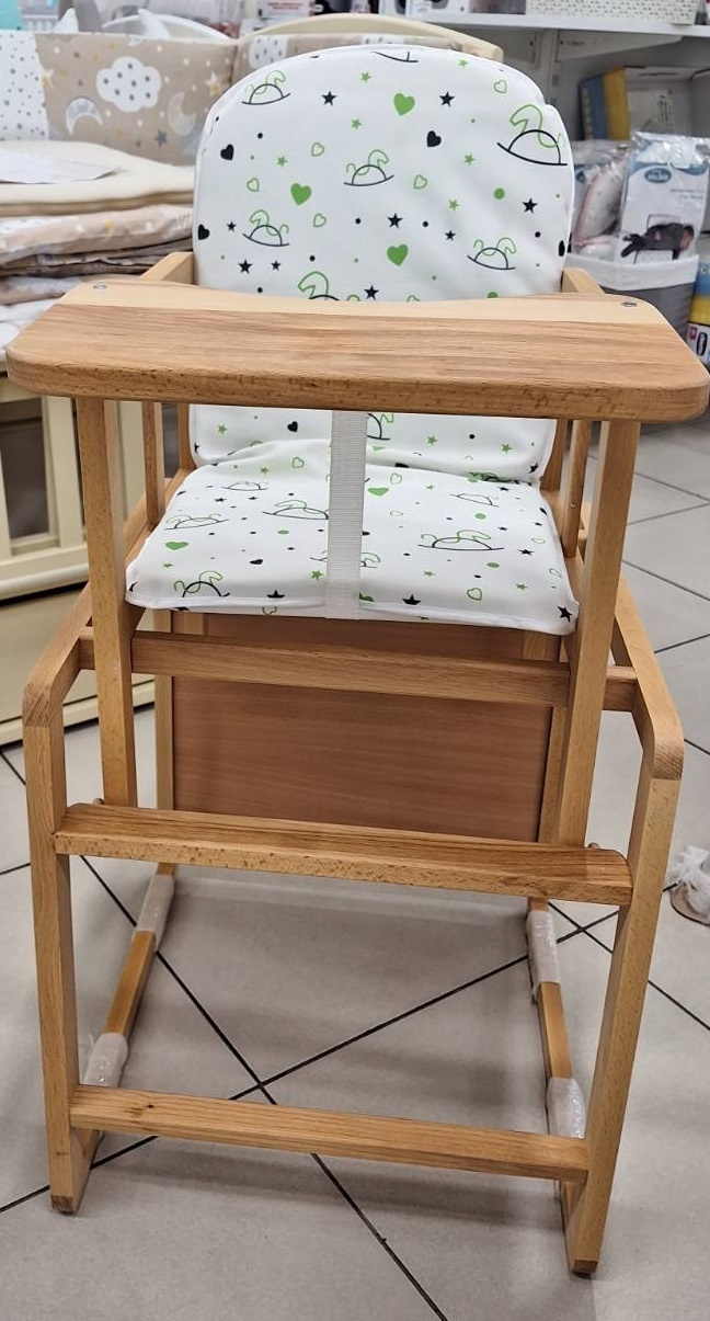 Scaunul are spătar moale și membrana din material pentru siguranța copilului. Materialul special de tapițerie este rezistent la murdărie și ușor de curățat. Fața de masă are laturi mici pentru a ține jucăriile pe masă.