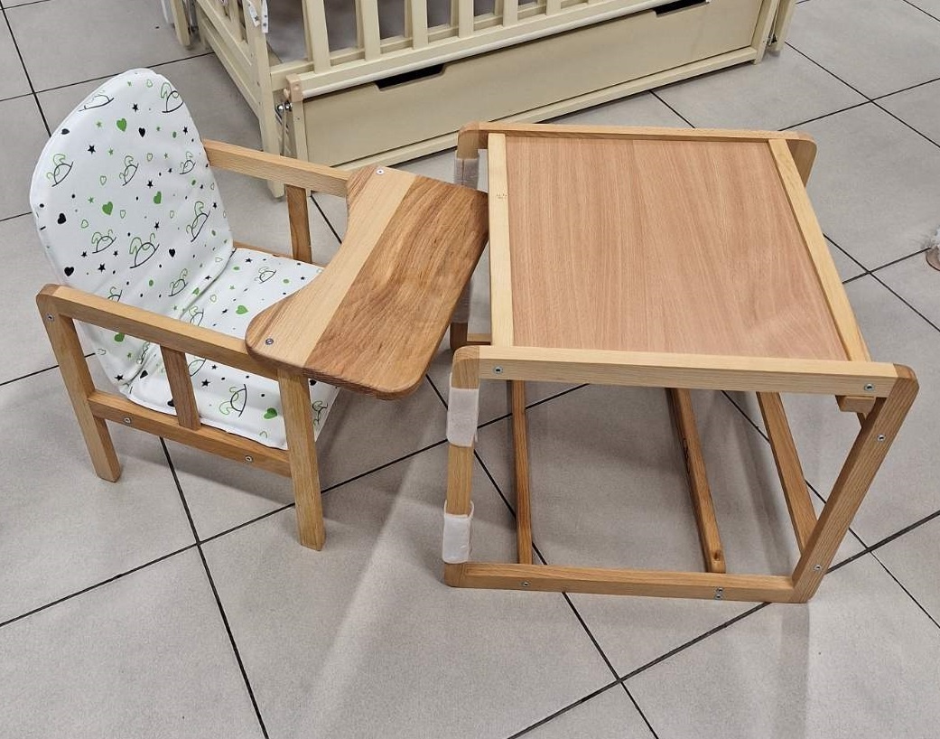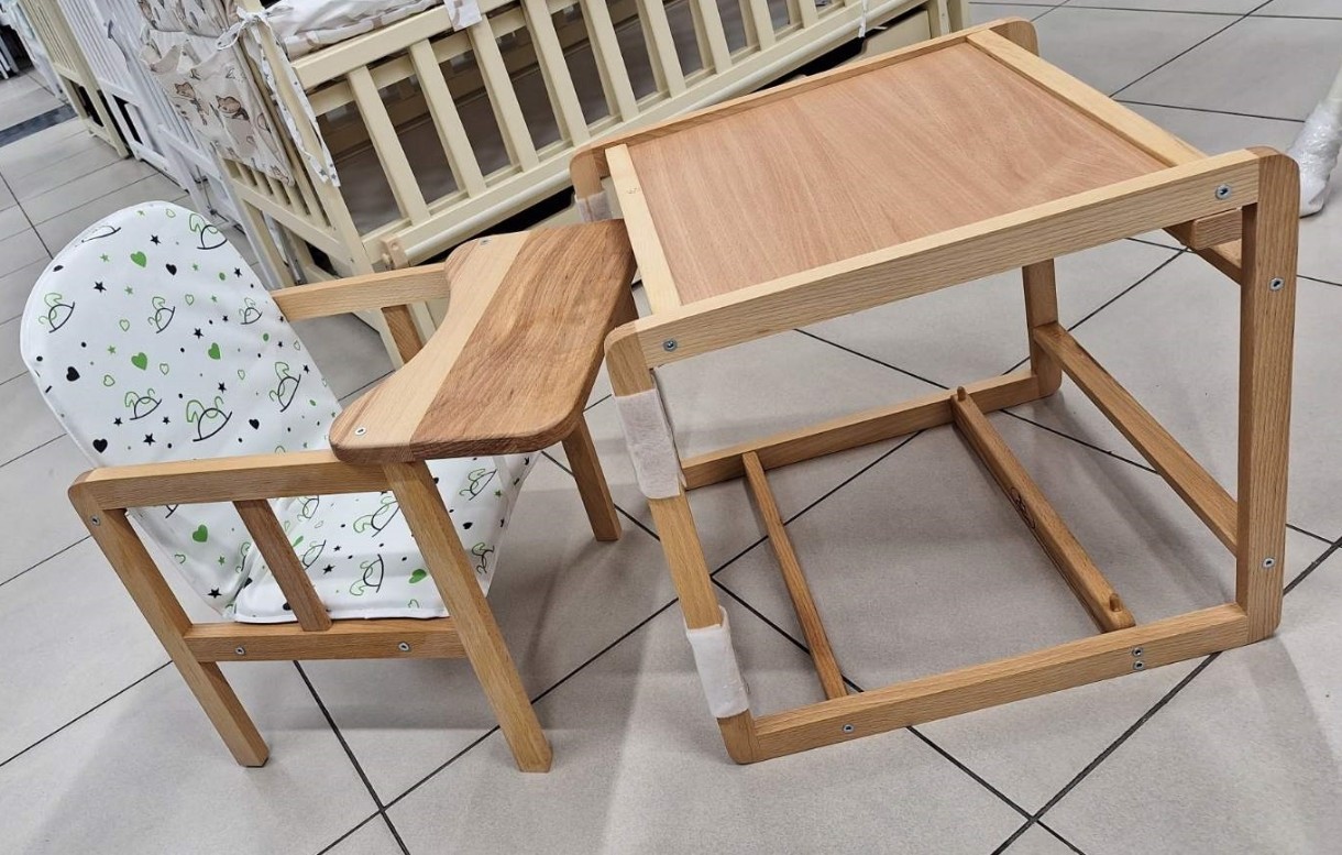 Scaunul este realizat din lemn de fag, șlefuit cu grijă și acoperit cu ulei de in ecologic. Constă din două părți, când este pliat, servește ca scaun înalt, iar când este asamblat ca masă cu scaun servește pentru desen, jocuri sau alte activități. Designul este durabil și rezistent la stres.