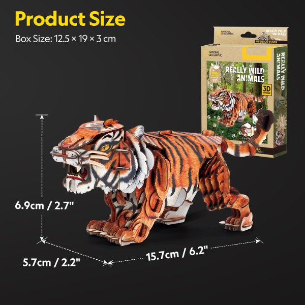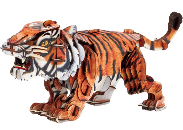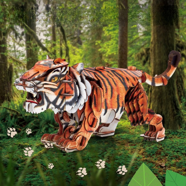 Compus din 87 de piese de carton reciclat, puzzle-ul se asamblează ușor fără unelte sau lipici, transformându-se într-un tigru realist cu un corp articulat, gata pentru aventuri în zăpadă.