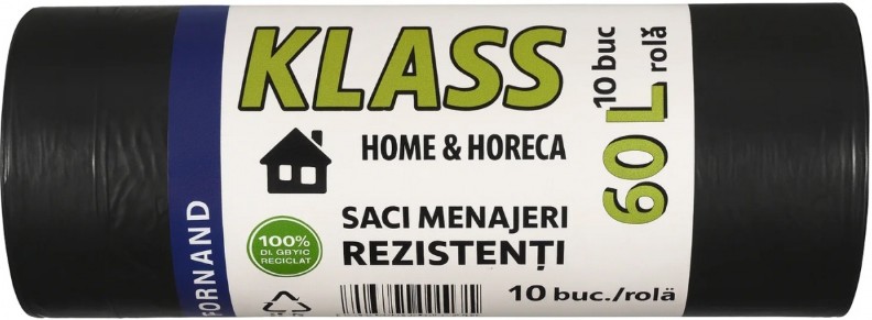 Sacii menajeri Klass, negri, 60 l, 10 buc. sunt saci rezistenți și practici pentru colectarea zilnică a deșeurilor menajere. Sunt confecționați dintr‑un material dens și dur, rezistent la rupere, care reține eficient gunoiul și previne scurgerile, chiar și atunci când sacul este plin. Culoarea neagră le conferă un aspect universal și discret, iar volumul de 60 litri este potrivit pentru bucătărie, baie, birou sau alte încăperi cu cantitate moderată de deșeuri. Pachetul conține 10 saci, ușor de montat pe coș sau container, contribuind la menținerea curățeniei și ordinii acasă sau la locul de muncă.